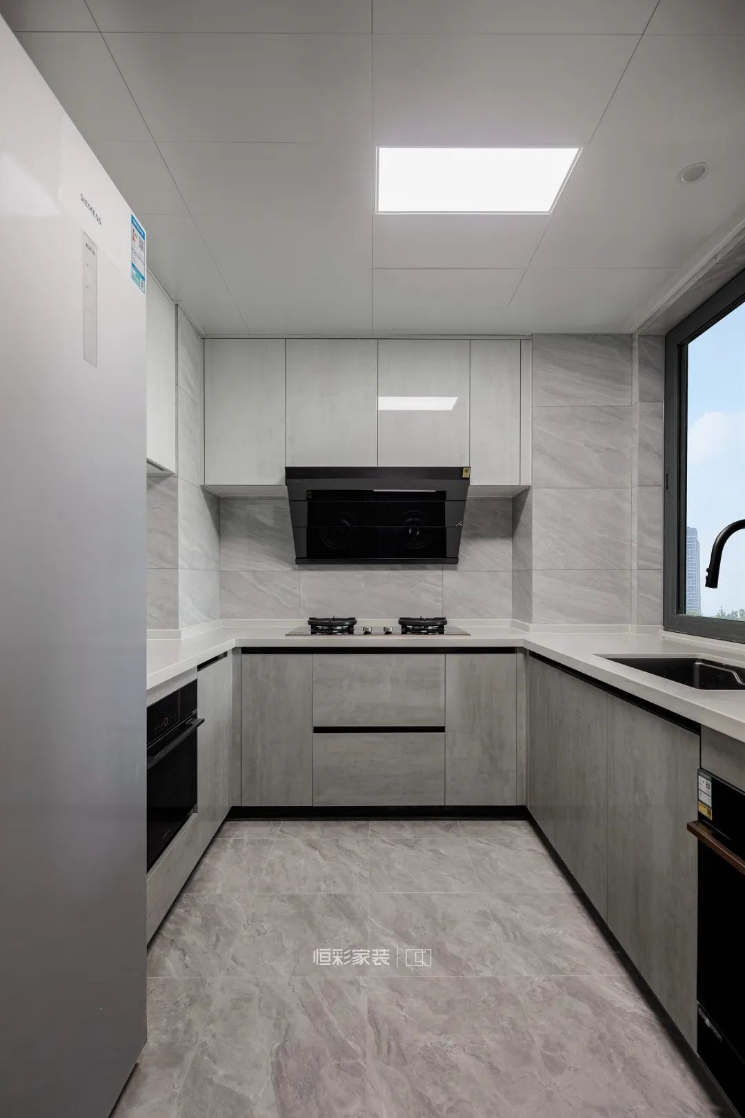 在配色上,厨房沿用灰白色系,白色亮面柜门清新又抢眼。