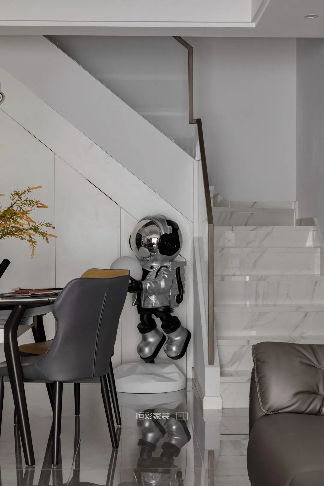 同时利用楼梯处留白空间,做了一个端景设计,摆放大型宇航员摆件,增添时尚感、未来感。