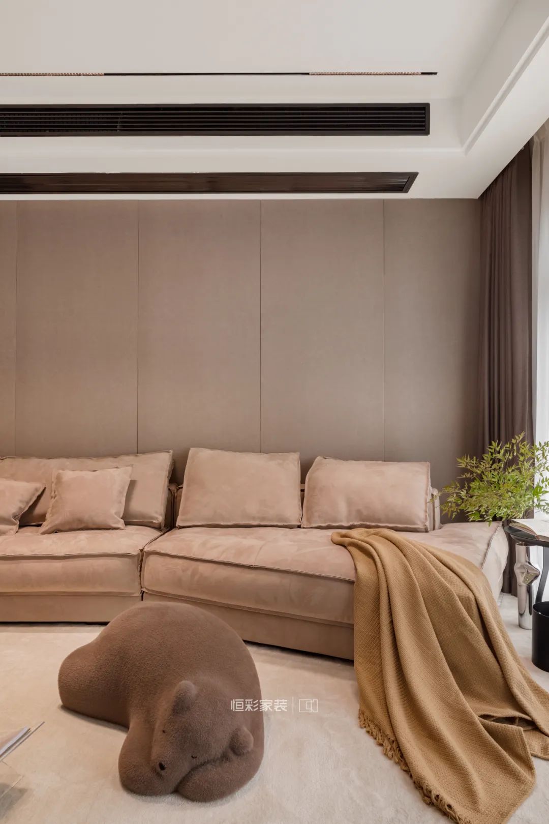 家里有老人有小孩,除了超大的异形转角沙发外,还有长颈鹿坐凳、趴趴熊懒人沙发,绵软质感带来温馨的视觉效果,可爱的造型更富有趣味性。