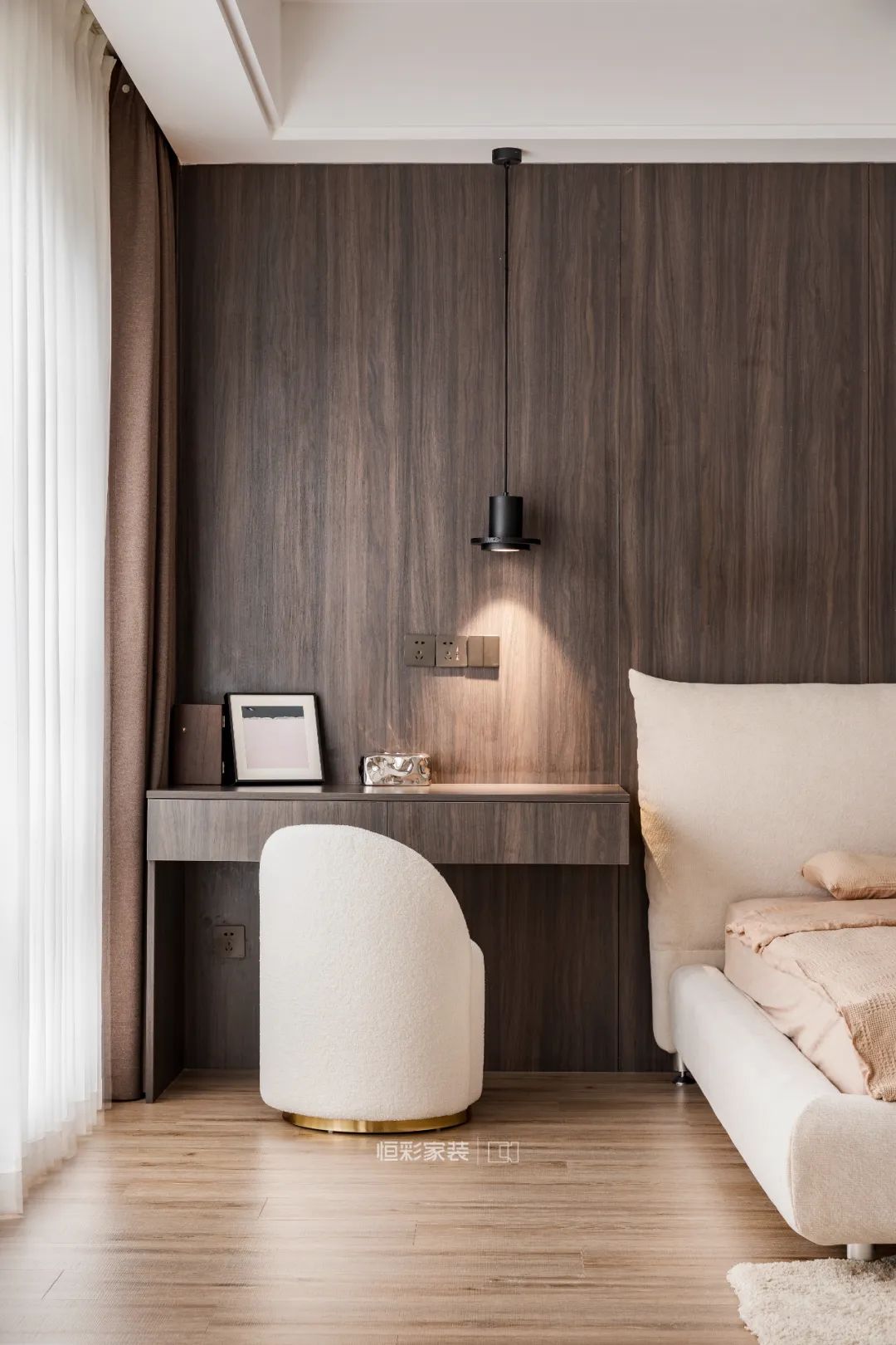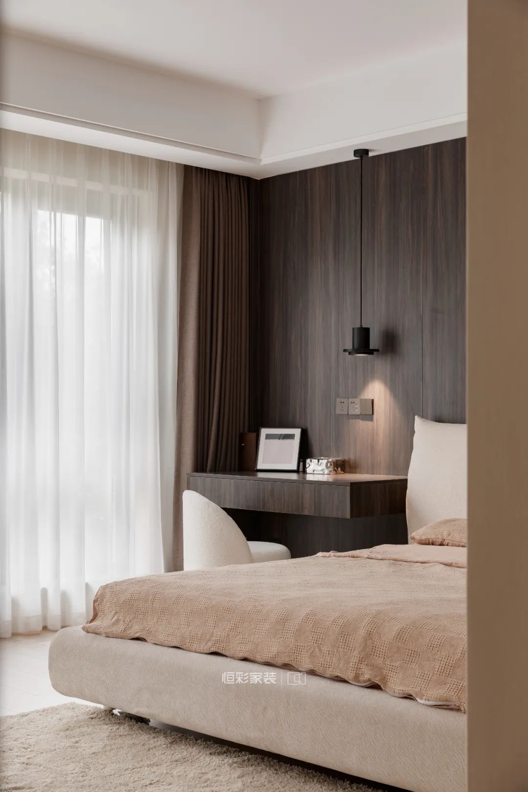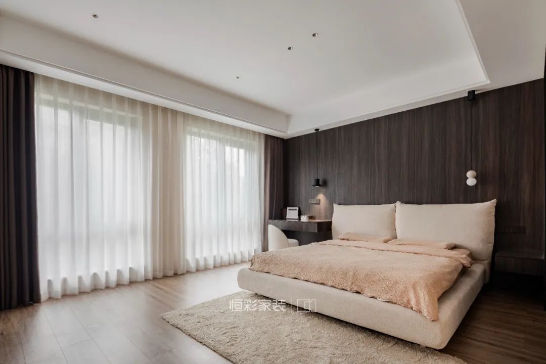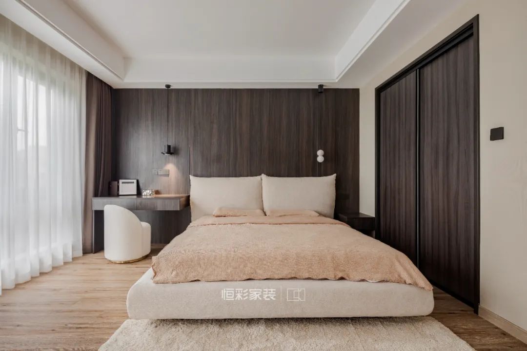 屋主偶尔需要工作,主卧设置了具备床头柜功能的工作台。窗帘则是低饱和度低的藕色系,这样的卧室空间能让人完全地放松。
