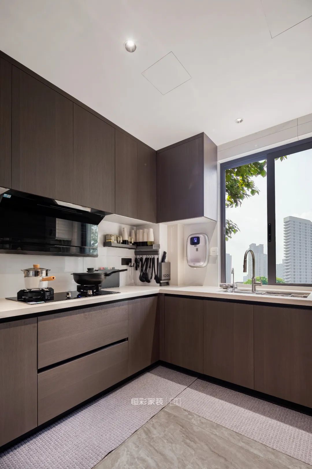 厨房整体设计偏现代风,更重视使用便利性、实用性,不管是地砖还是橱柜都以深色系为主。
