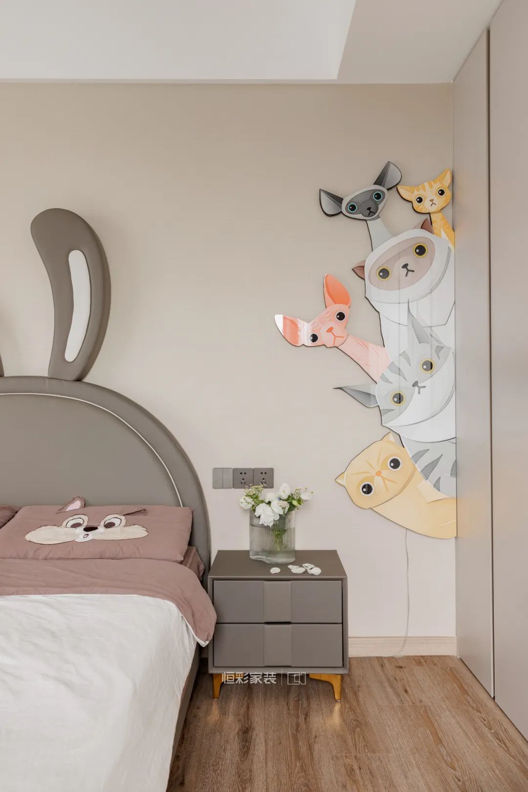 床头还安排了小猫家族的装饰画,也是氛围灯,前面提到的爱猫周边就是这里了,点缀空间且富有趣味性。