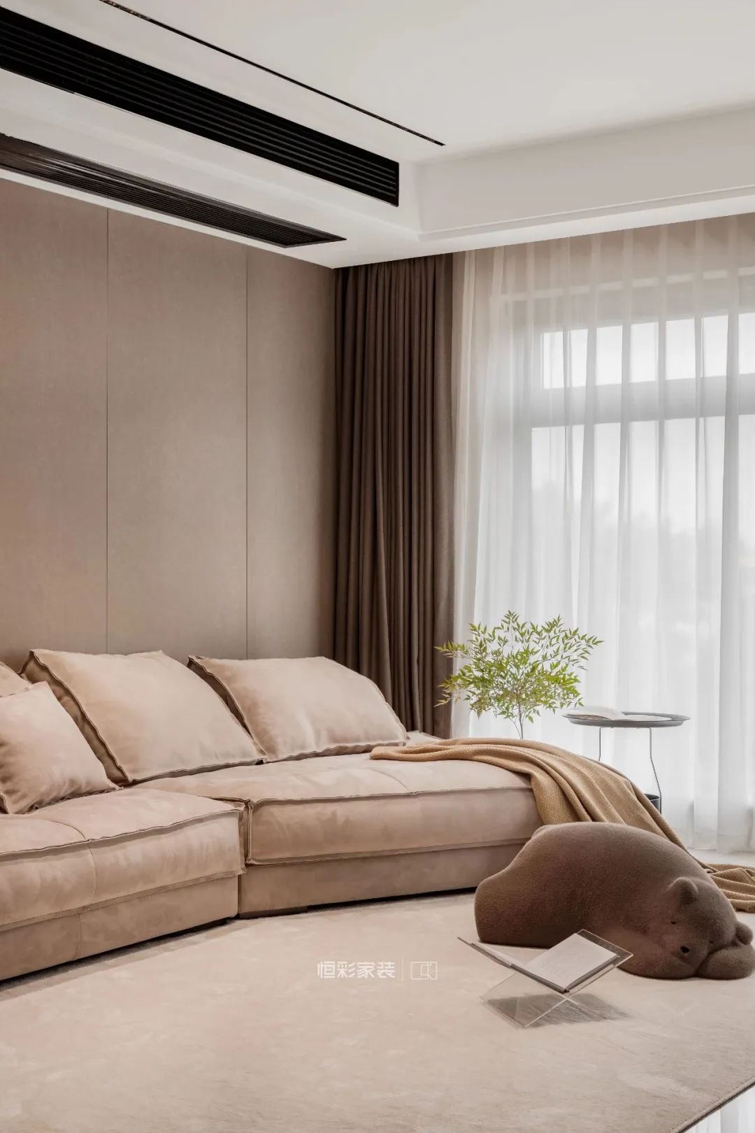 奶油调的超大沙发带来无法抵御的治愈力,绵软的视觉感受搭配绿植、良好的采光,营造慵懒、惬意的家居氛围。