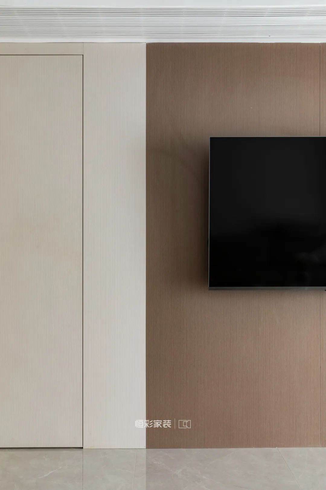 无主灯设计简化了整个顶部空间设计,配合嵌入式筒灯设计,不压层高。客厅背景墙与通往次卧的隐形门错开层次,兼具质感与设计感。
