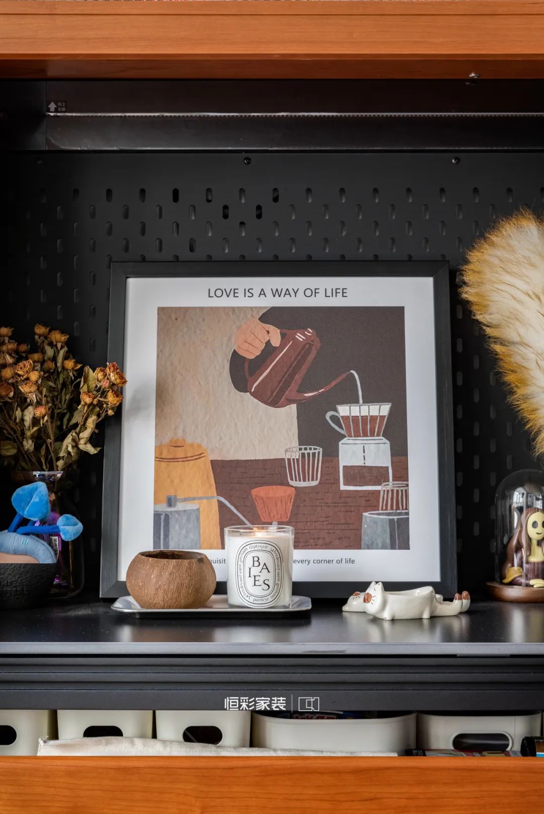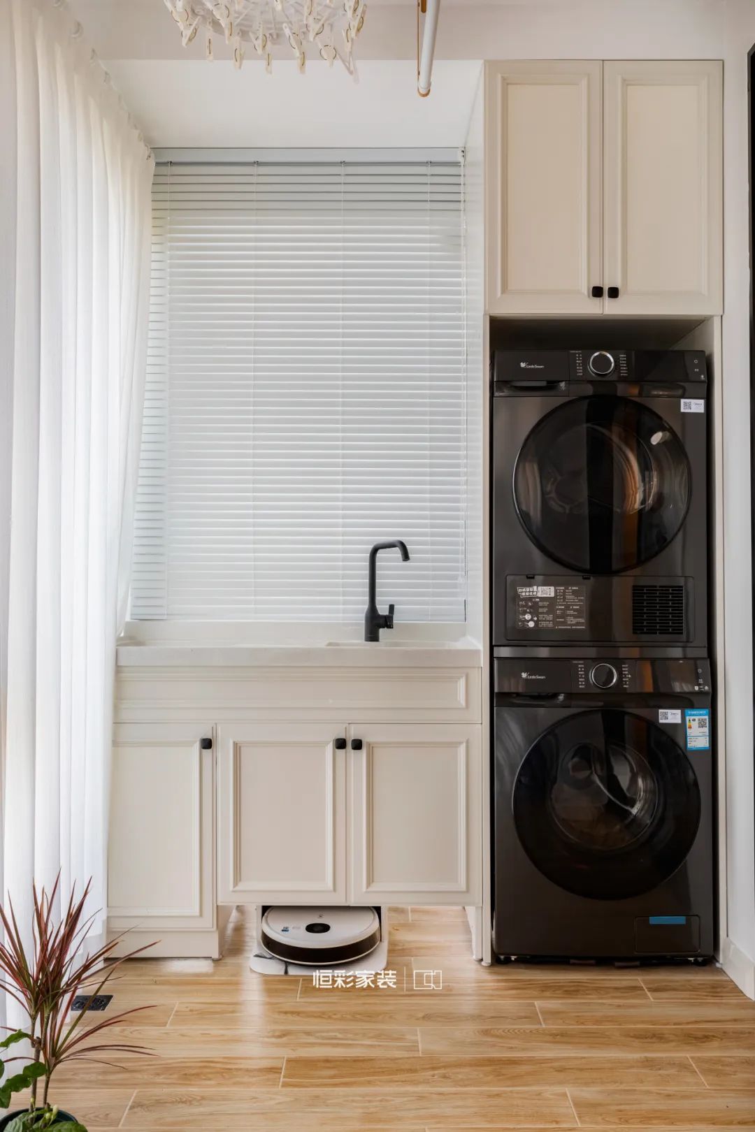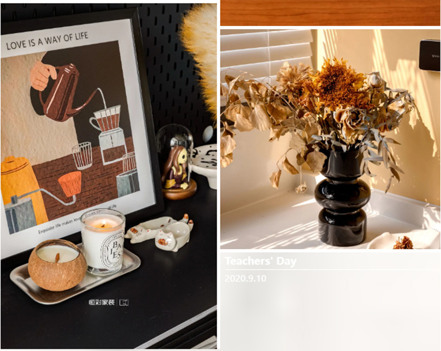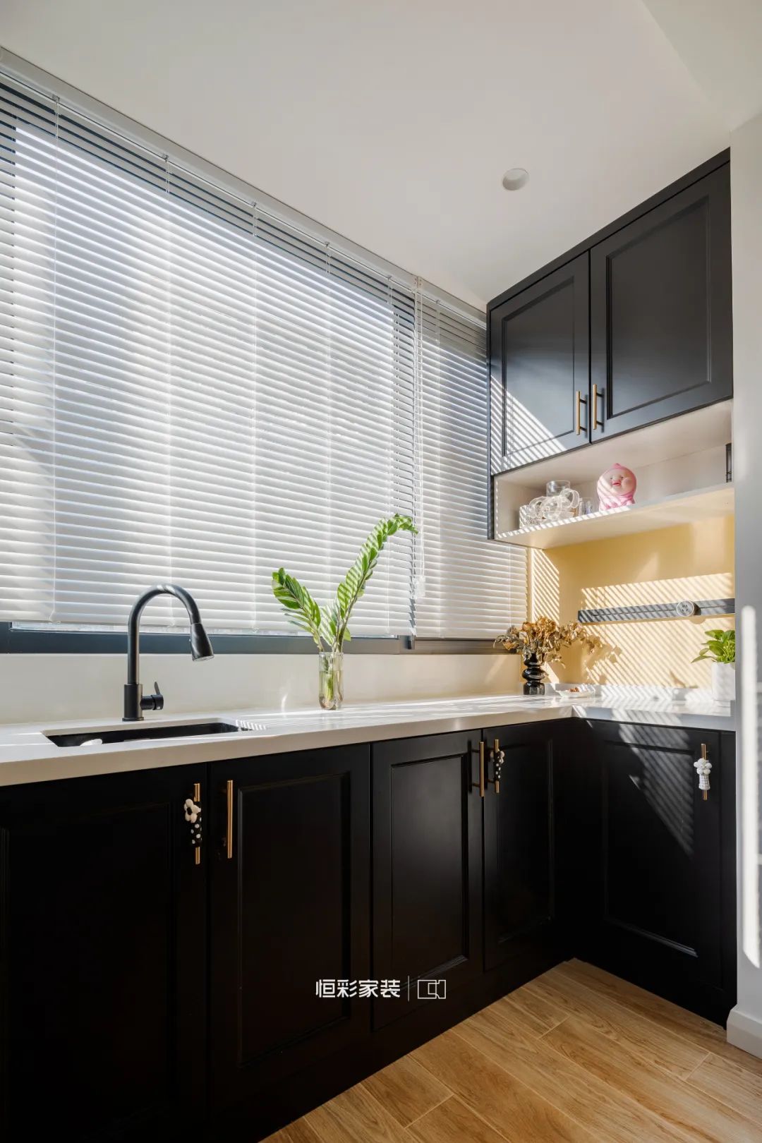 餐厅侧阳台改造成西厨空间,黑色西橱柜增强复古氛围,黄铜把手、花朵把手套,于细节之处升华空间格调。