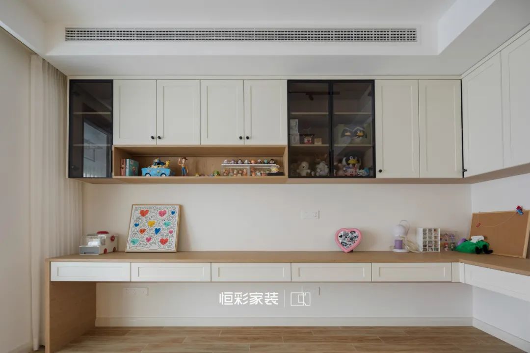 屋内定制吊柜+L型悬浮书桌,奶油+原木柔和干净,其他区域大面积留白,灵活可变,提升整个空间高级感。