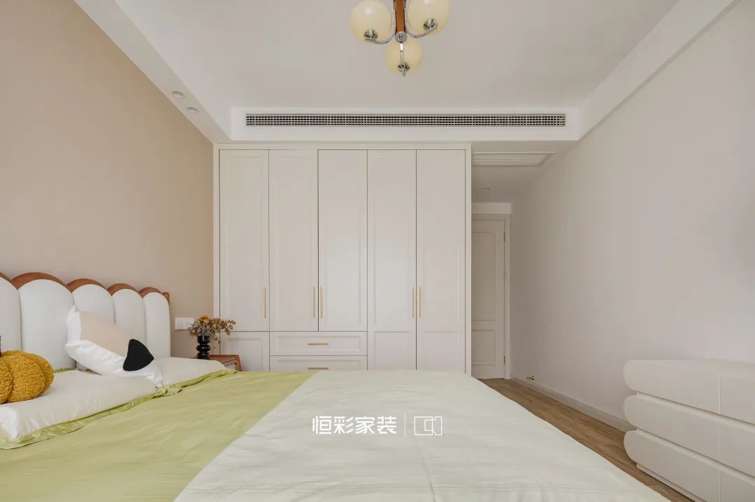 主卧的配色与客餐厅趋同,只是色彩更暖,奶杏色背景入室就能感受到睡意,就连窗帘也巧妙融于其中,奶油氛围全部拿捏!