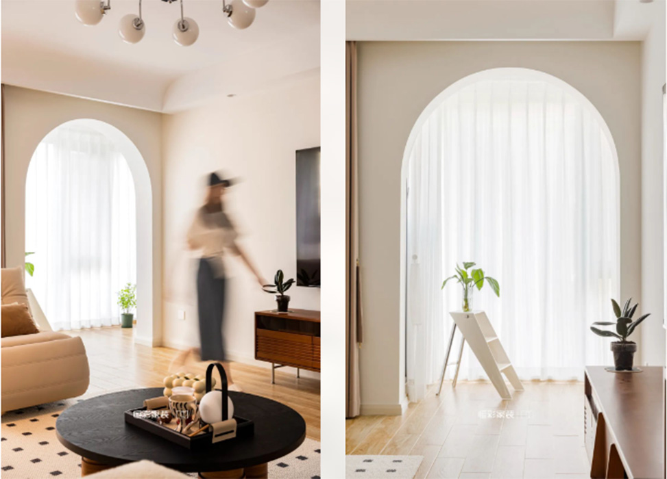 多功能房一侧是生活阳台,客厅也与阳台相通,拆除移门改弧形门洞完善动线。
