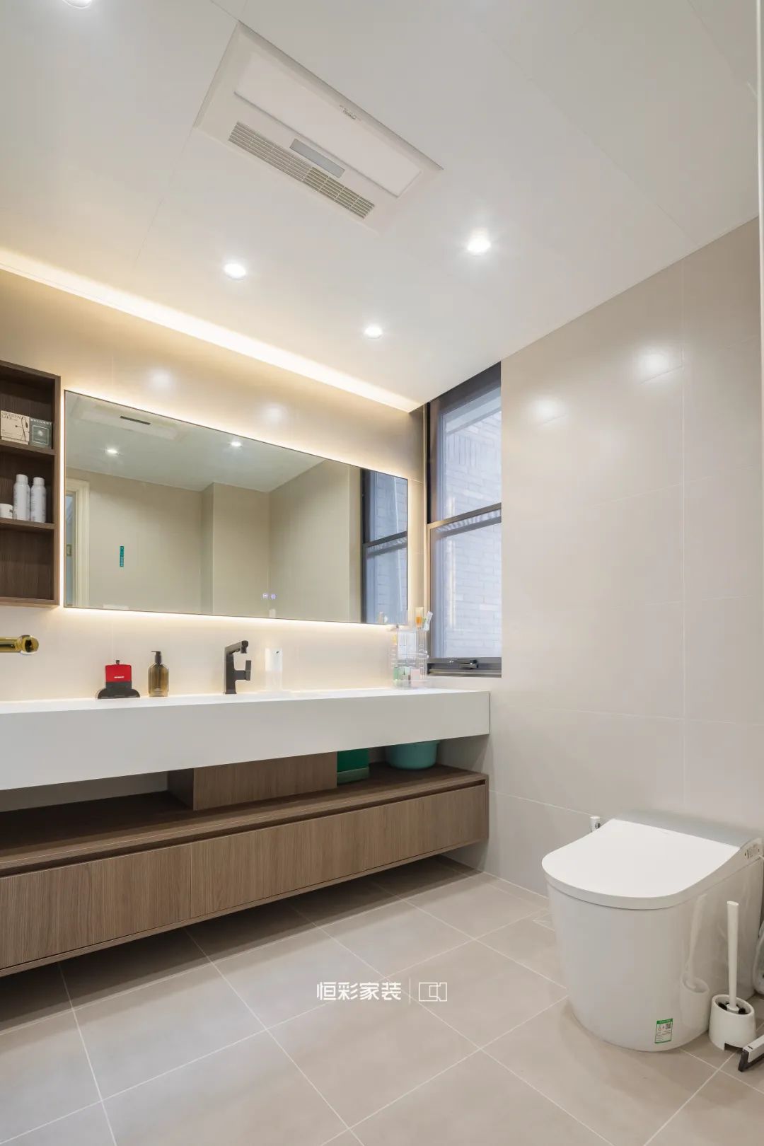 主卫空间宽敞,洗漱区由瓷白台面搭配原木收纳柜组成,镜面创意点缀灯光,洗漱身心放松。