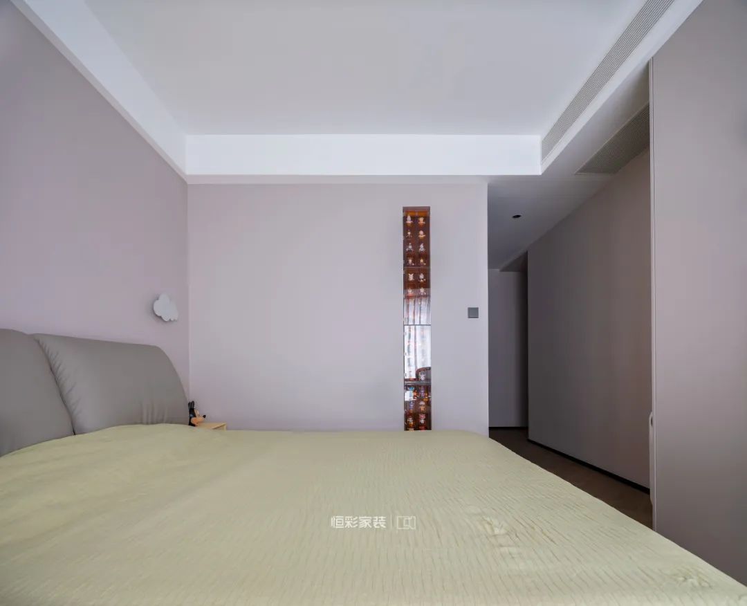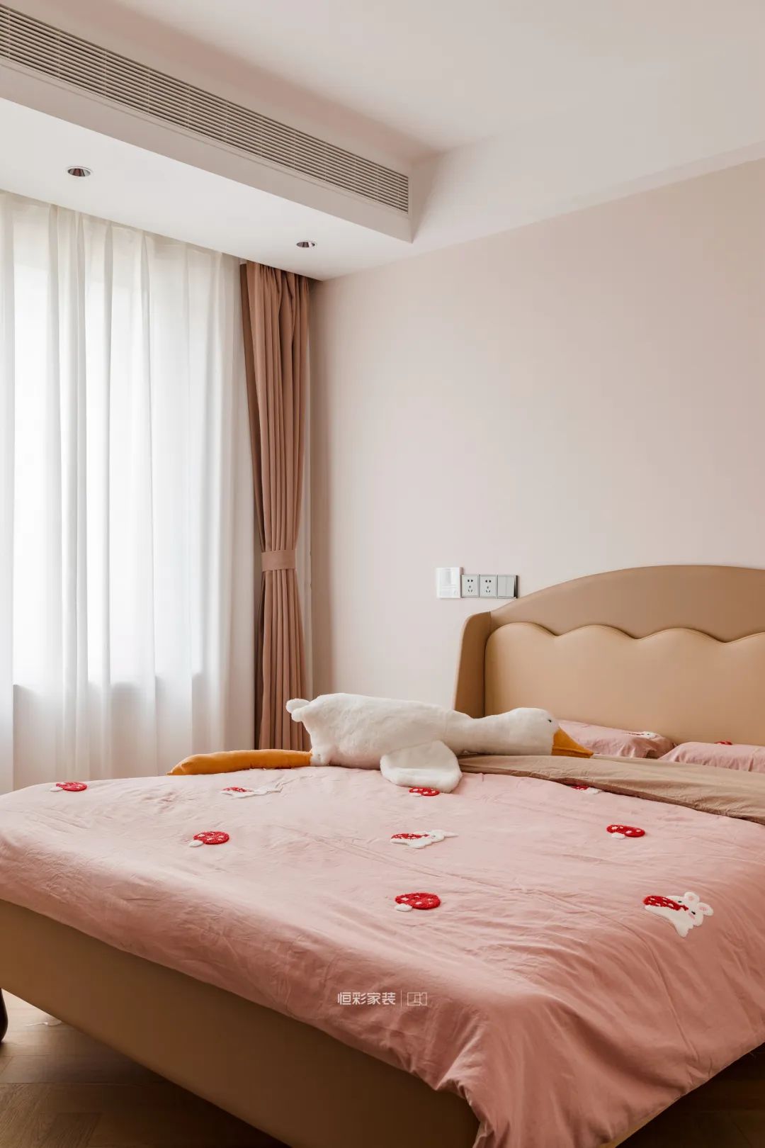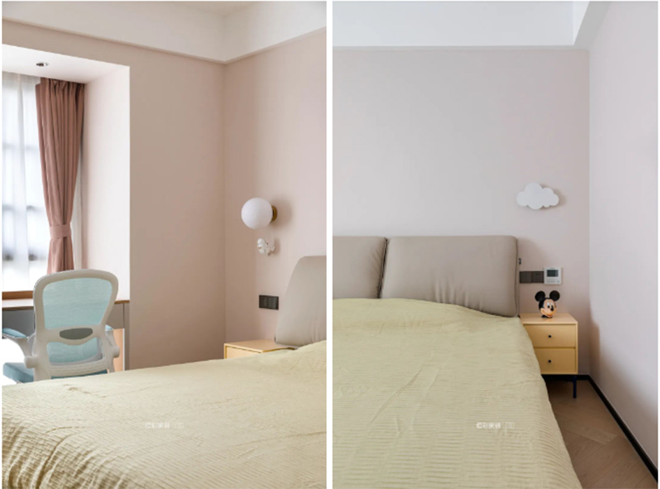 次卧与女儿房那个整体风格相近,裸粉色使整个卧室空间视觉升温,显得十分温柔。