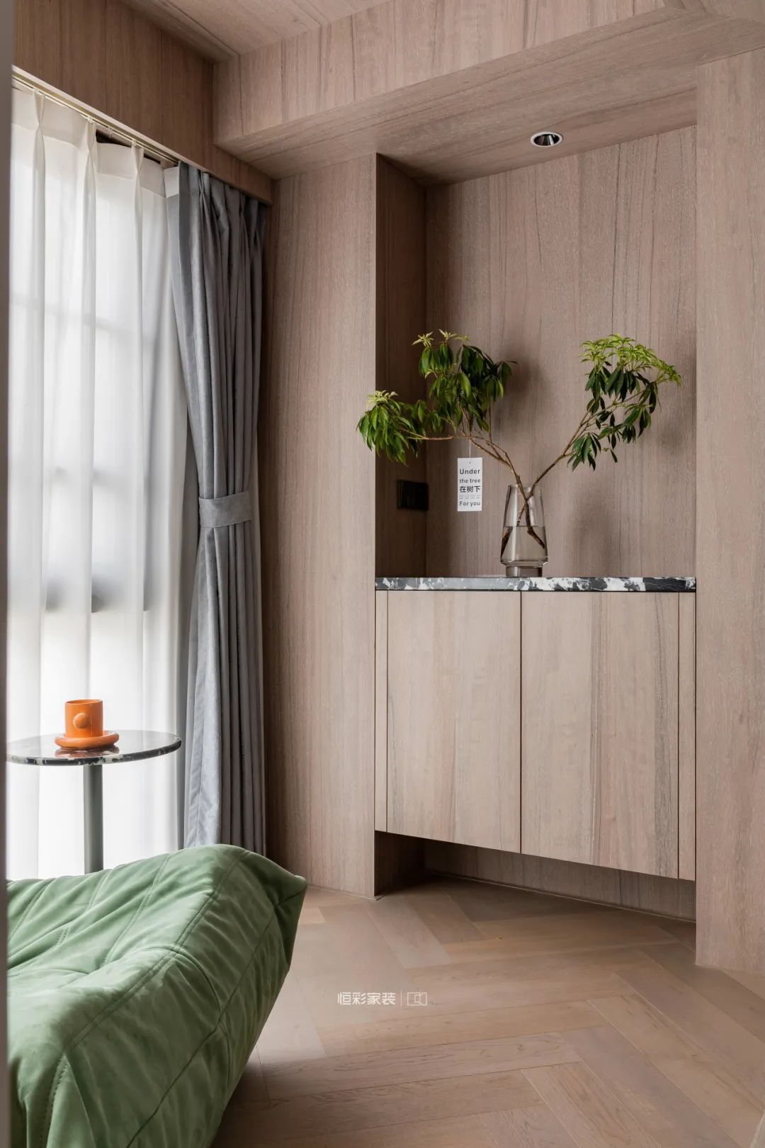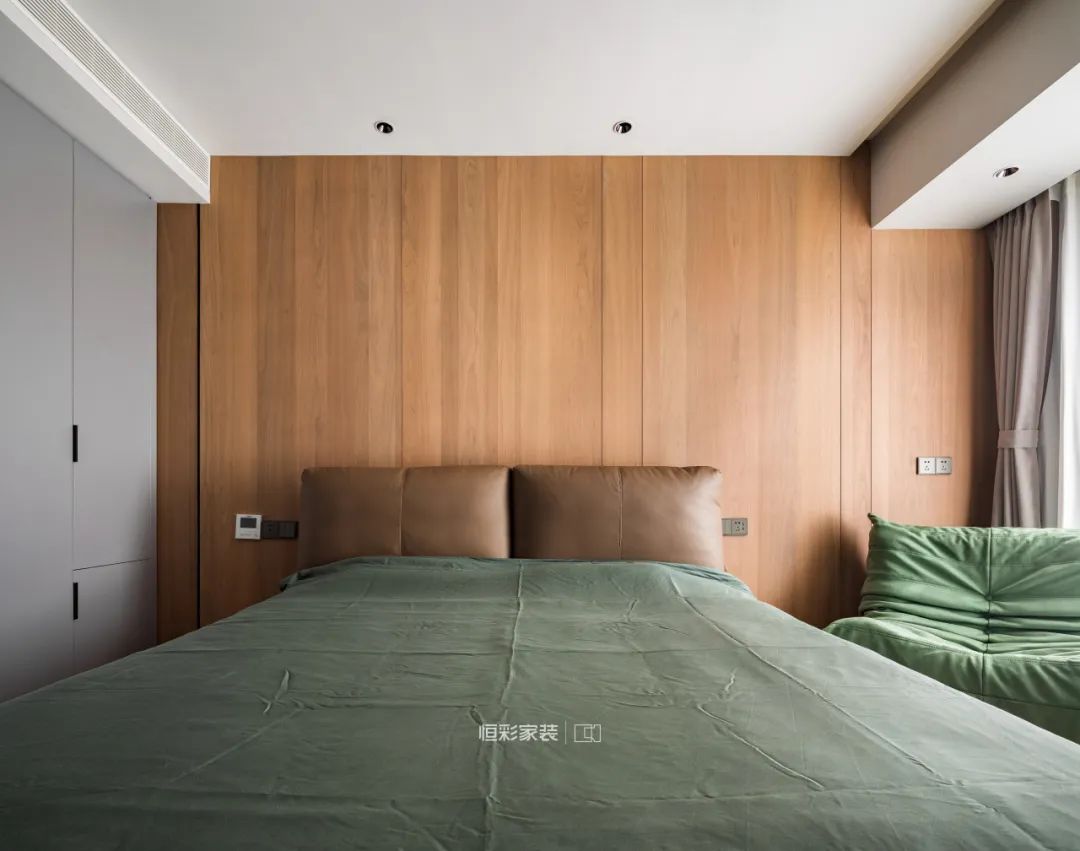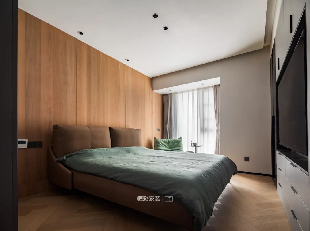 进入主卧,原木饰面装饰背景墙,与动区色调保持统一,实木地板人字拼打造温馨舒适的居家氛围感。