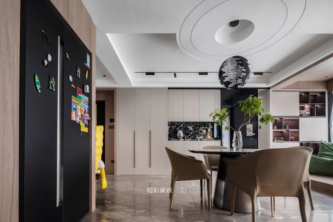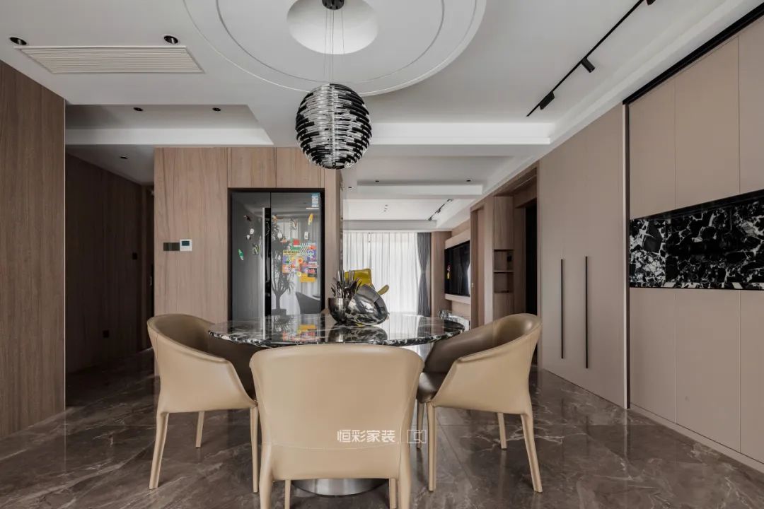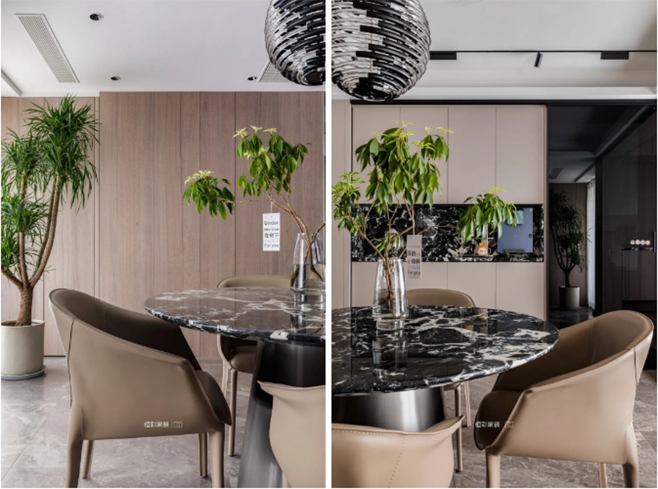 餐厅扩容后成为动区设计一大看点,整体圆形布局给人一种聚合的视觉体验。餐厅处于户型和家庭活动的核心位置,以圆形吊顶、球形吊灯呼应客厅弧形元素,大理石餐桌适配度满分。