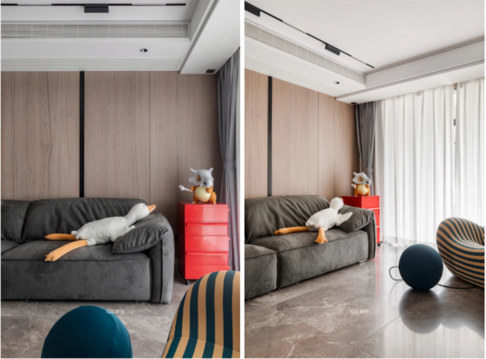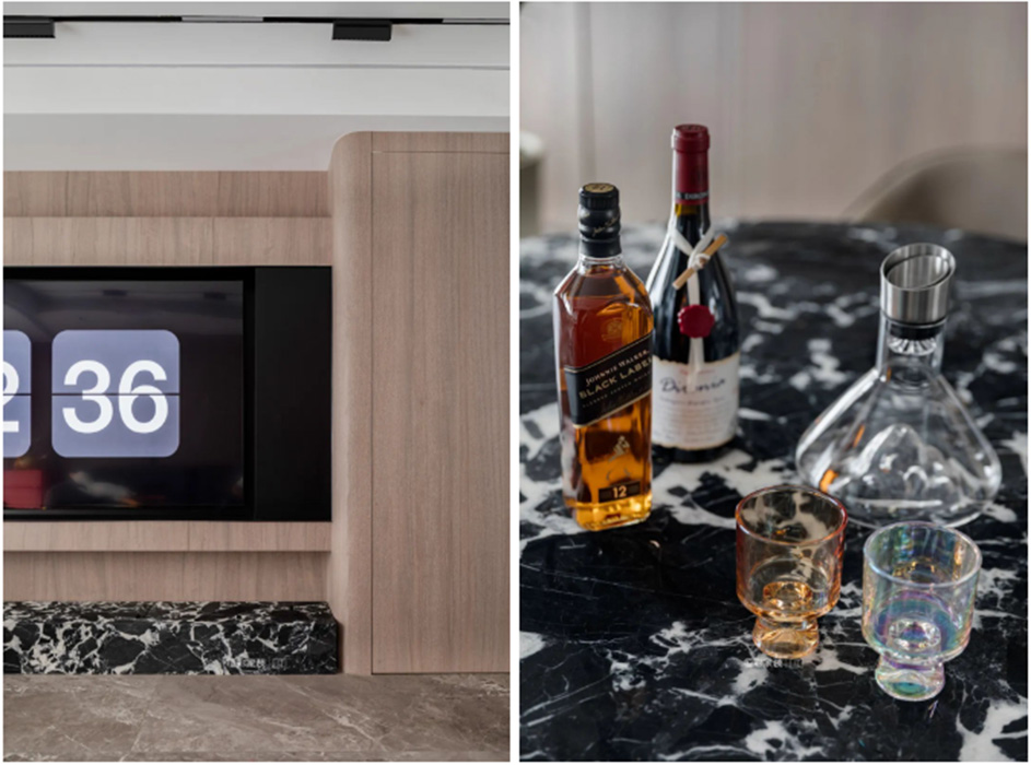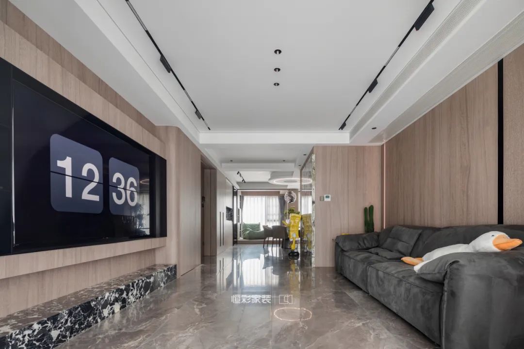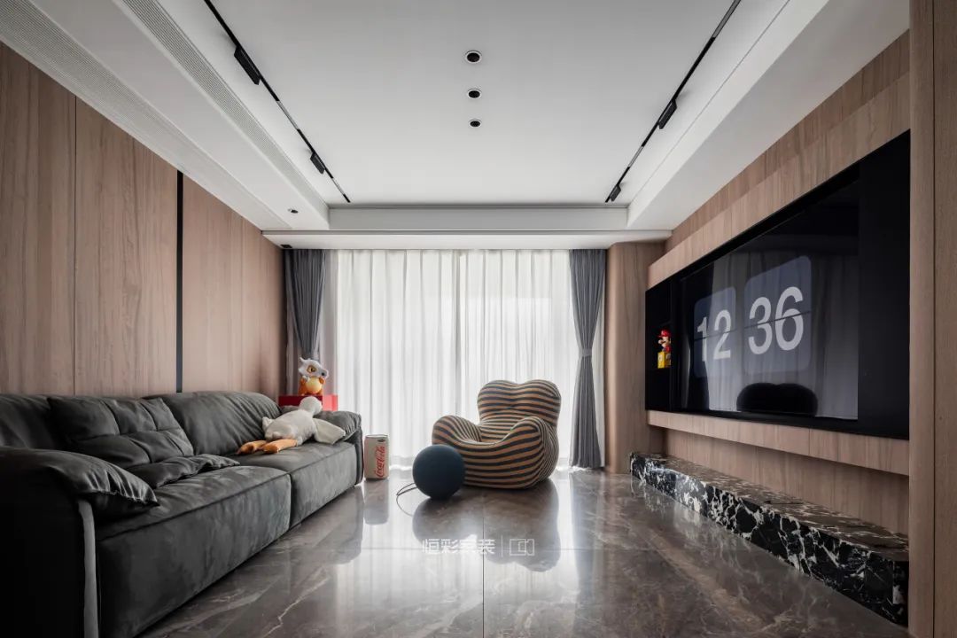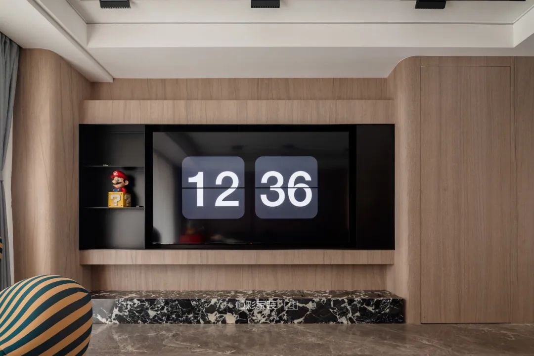 客厅电视背景墙的处理上以统一为核心,木饰面为大背景打底,错层定制柜体再嵌入电视机,转向女儿房隐形门的墙体顺势做弧形处理,打破横平竖直的单调,同时空间的延伸感也有了。