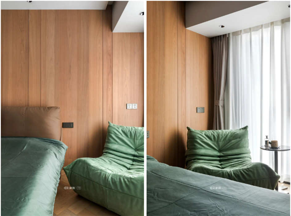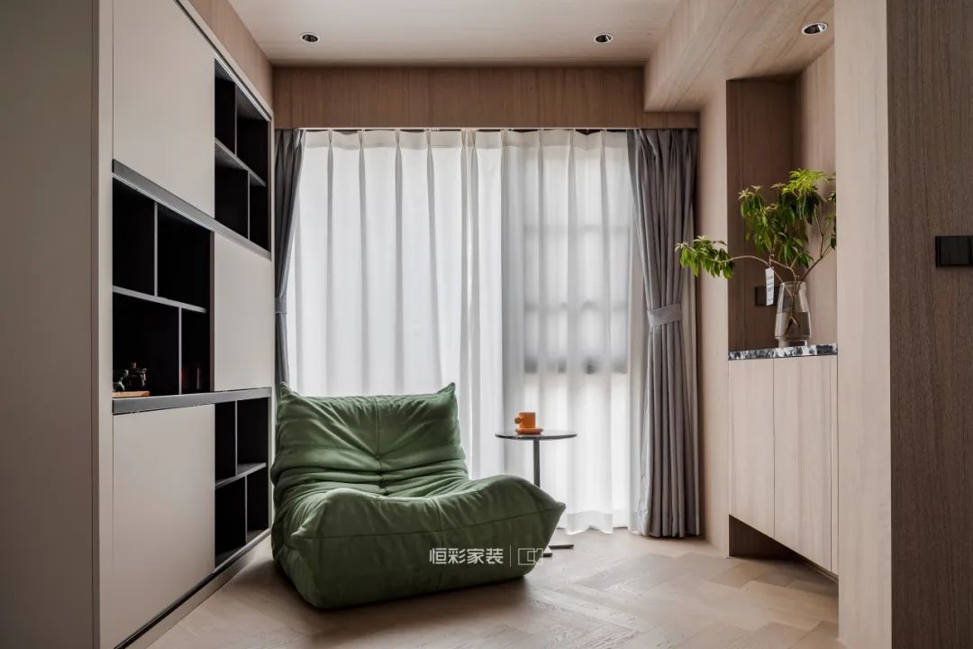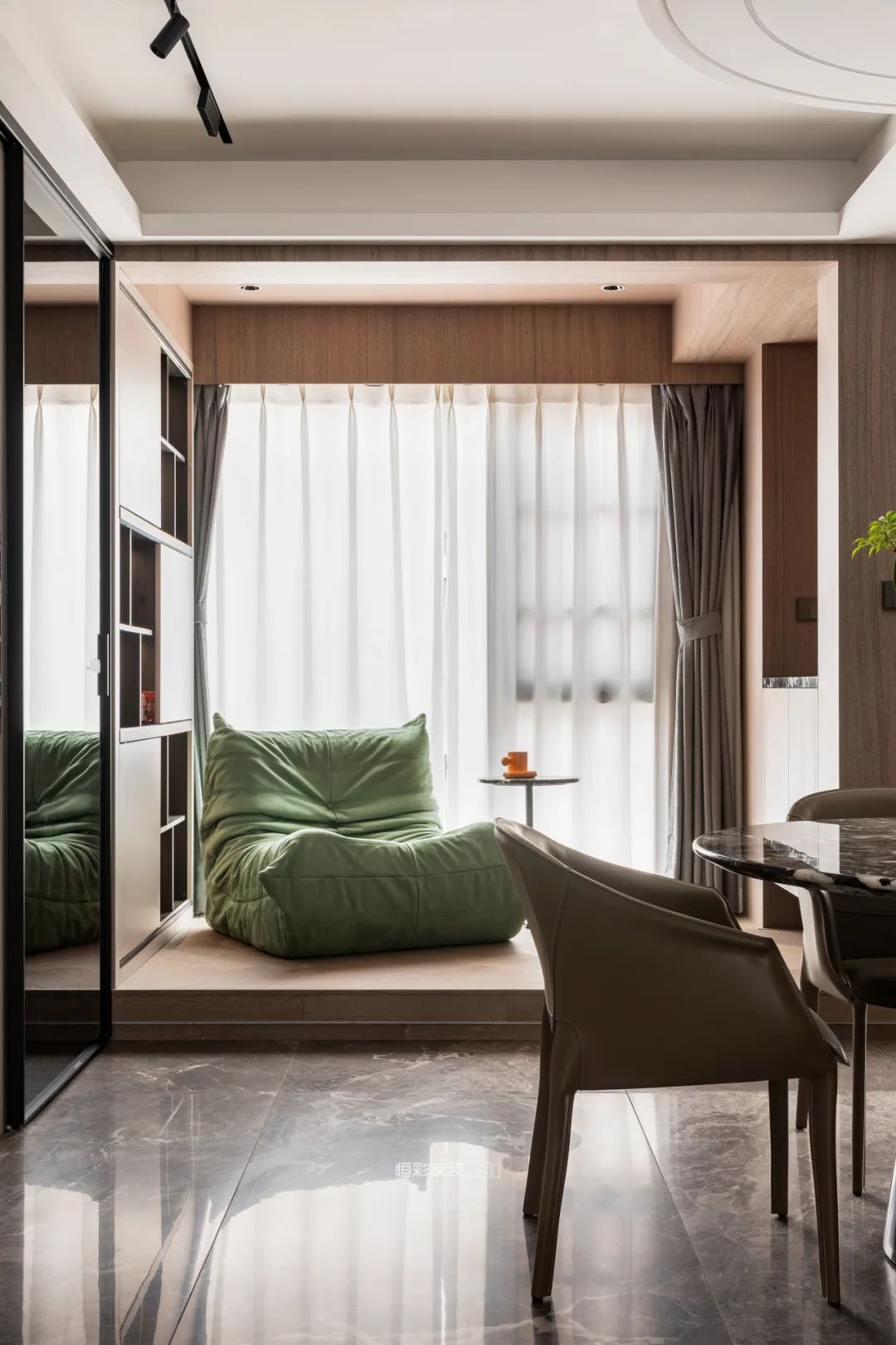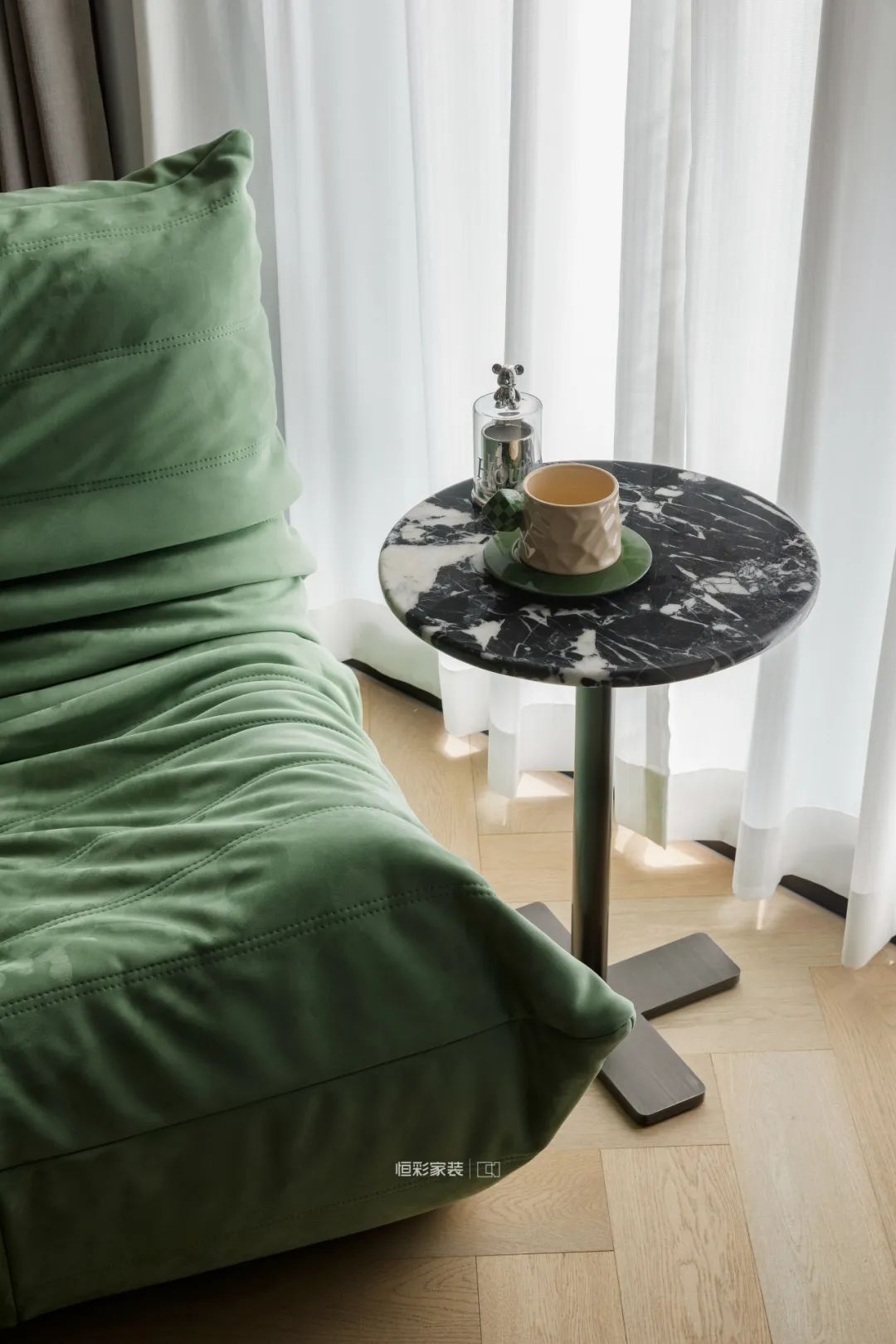 主卧采光绝了,拉上窗帘时与世无争,靠窗位置成为一个独立的休闲空间,复古绿的休闲沙发搭配大理石边几深邃,与整个空间稳重大气的格调很搭。
