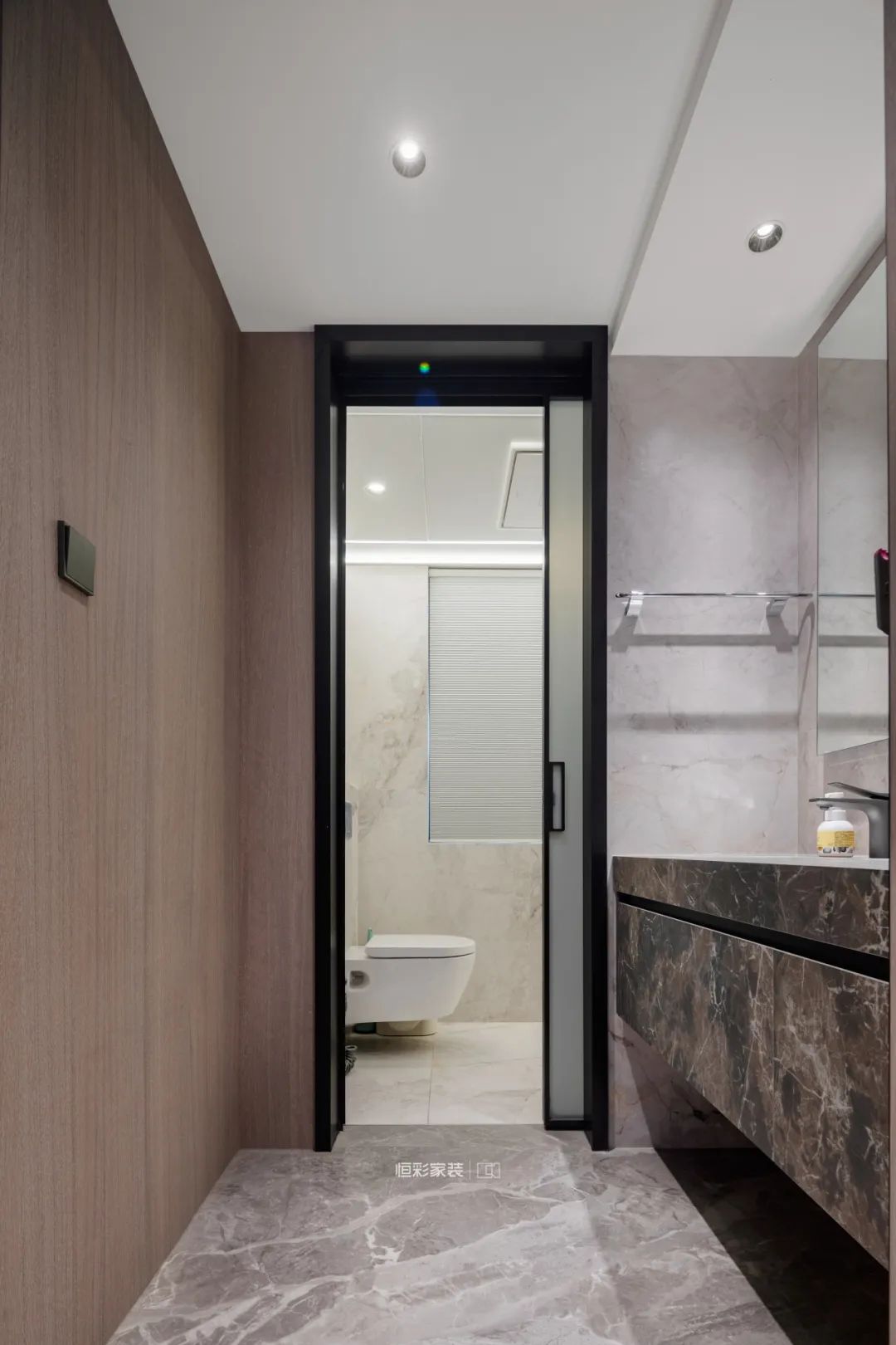 客卫干湿分离,悬浮马桶避免卫生死角问题。墙地面选择与客餐厅同款木饰面与地砖,整体有一种浑然一体的大气感。