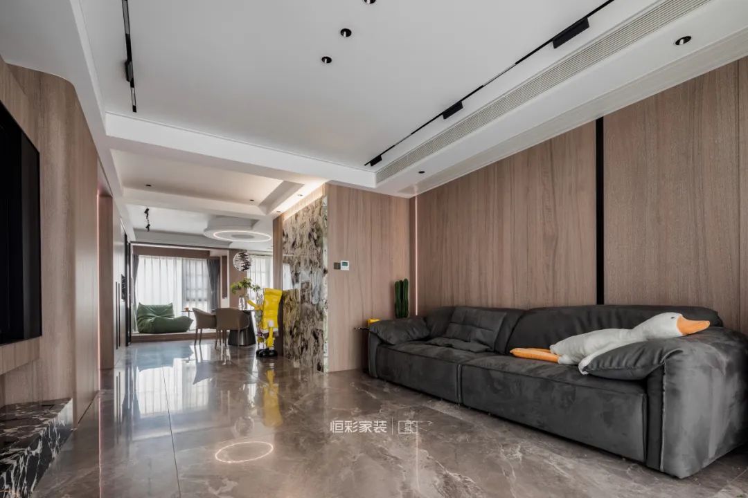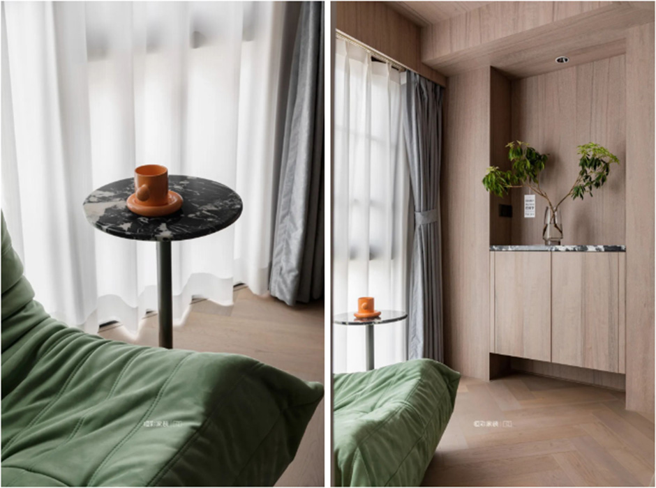 玄关避免了室外直接观室内全景的尴尬,以木格栅为背景拼接大理石造景,入户艺术感拉满,海绵宝宝时时迎接主人回家,俏皮治愈,端景区很好地衔接到客厅区域。