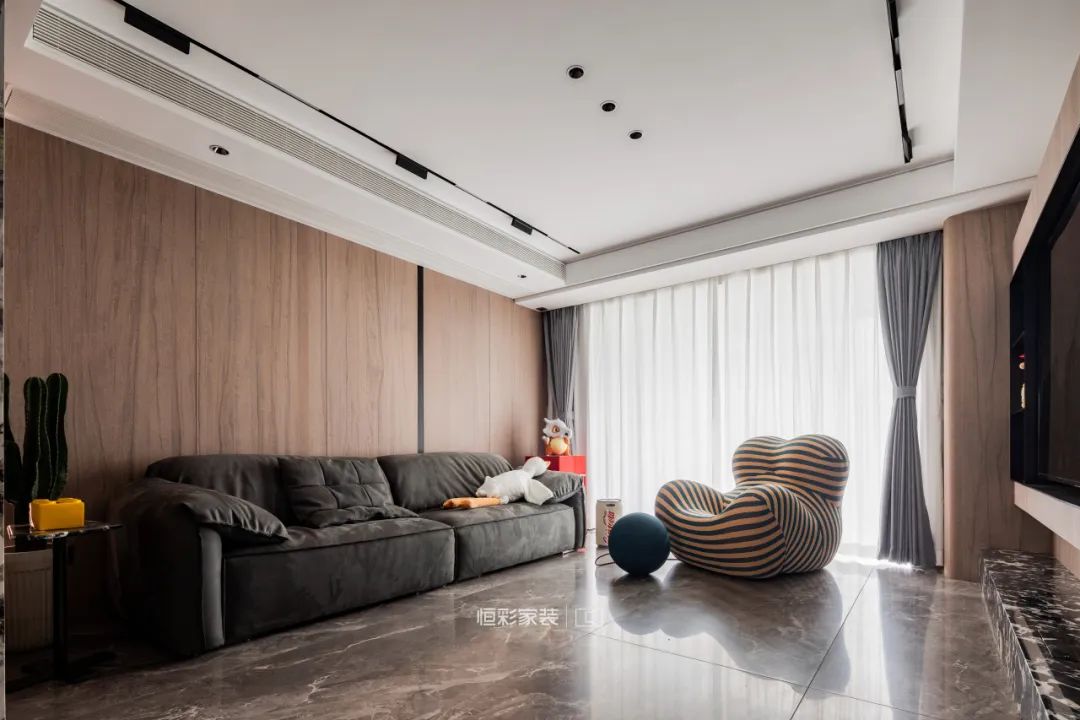 客厅采光面超大无另加主灯,磁吸灯作为点缀光源提升整体造型感和设计感。