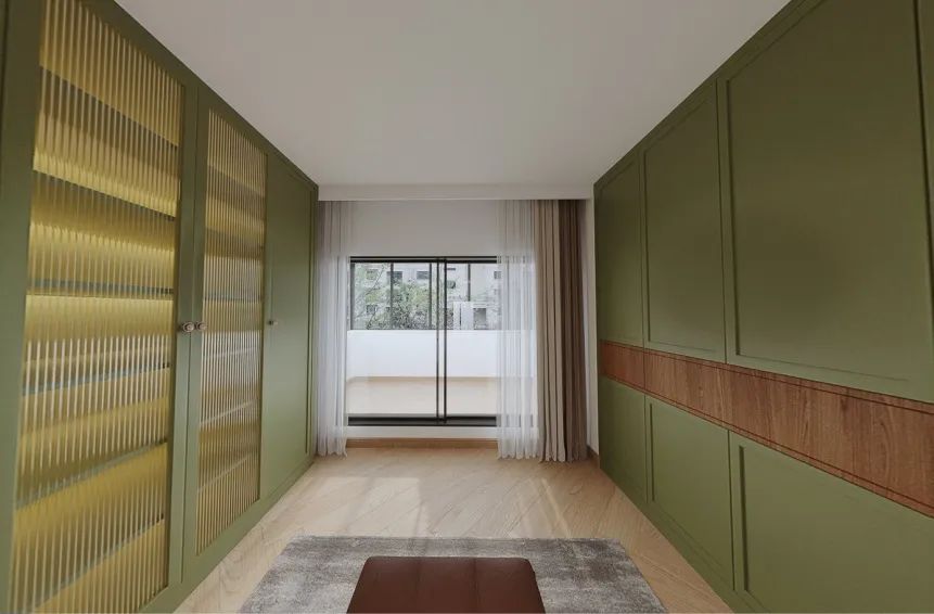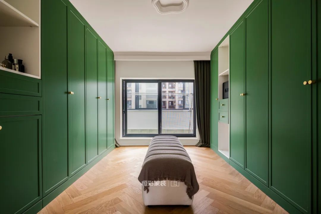 衣帽间配色延续复古绿的浪漫纯粹,纯正自然的温润色泽搭配金属把手带来更亲密的触感,公主请尽情享受专属更衣室带来的愉悦感吧~