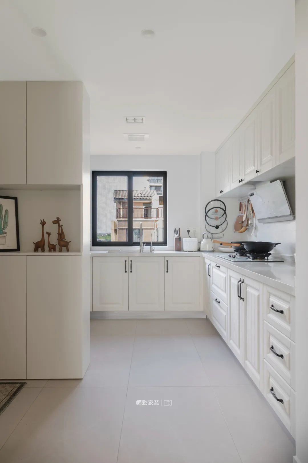 厨房整体浅白橱柜搭配黑色把手,顶面墙面也选择浅色视觉显大。地面通铺浅哑光砖,与客餐厅部分的过渡更自然。