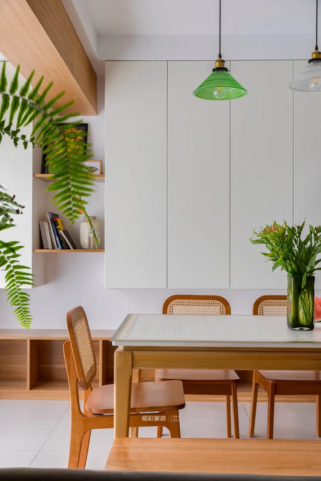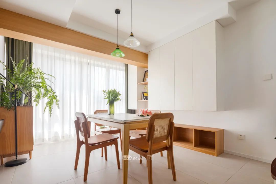 餐厅区域全景落地窗恰似网红餐厅,一方餐桌承载起一家人的小确幸,桌面细腻纹路满满南洋浪漫风情。屋主小姐姐对藤编元素非常偏爱,搭配原木藤编餐椅、带点复古格调的吊灯,随手一拍,就是家居杂志封面。