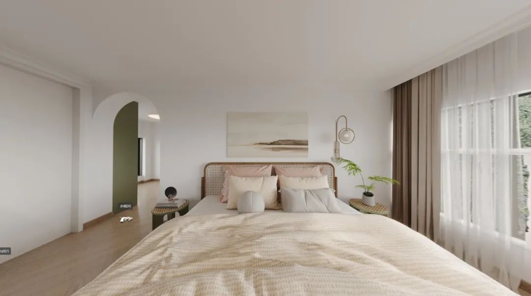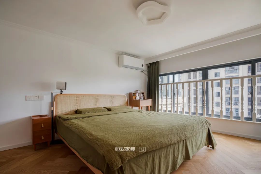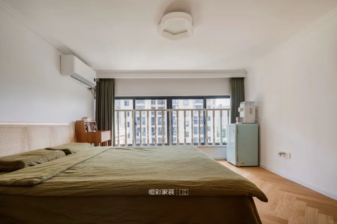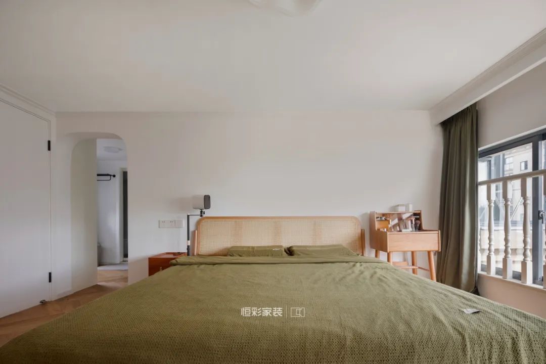 卧室硬装同样以原木+白为主,背景墙不做装饰,原木藤编元素搭配复古绿,起居空间温馨舒适,浮躁的心得以舒展、平静。