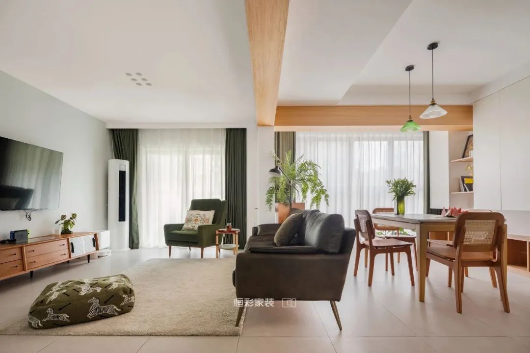 客餐厅一体,功能区保持互通、互动,顶面用木纹横梁为视觉隔断,以大自然的力量打造舒缓调性的中古风,再搭配大量原木家具、墨绿色软装配饰、热带阔叶绿植塑造南洋风的热情个性。