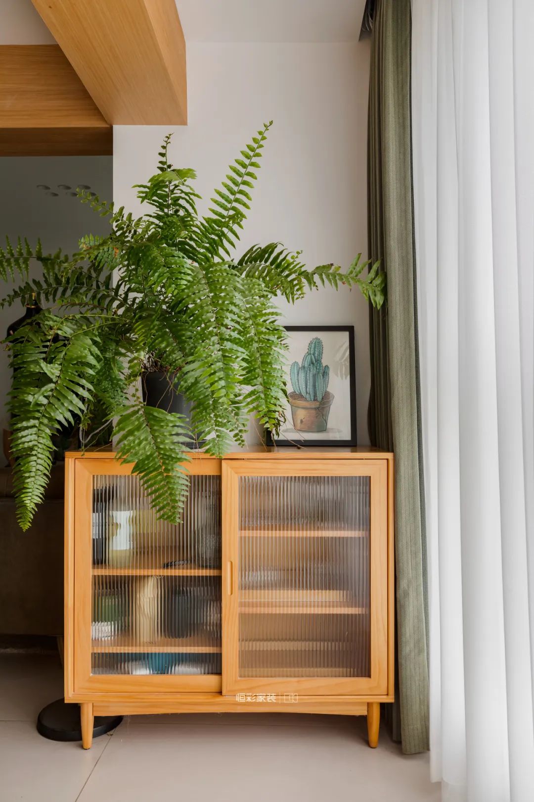 餐厅没有定制餐边柜,半高成品边柜足以放置一些小餐具和小零食,风格上也都是暖暖的复古焦糖原木色,诗意与烟火并存。