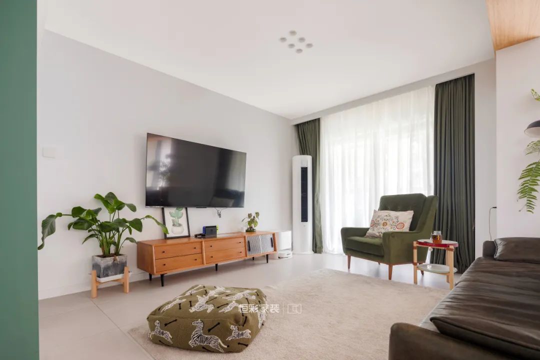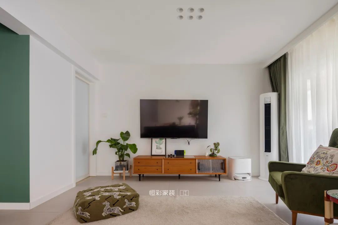客厅是家人频繁互动的区域,也是亲友来访的主要活动空间,索性去除茶几与多余装饰,大面积留白铺上地毯,夫妇俩可以边观影边聊天,也方便和家里的小宠物一起席地玩耍。