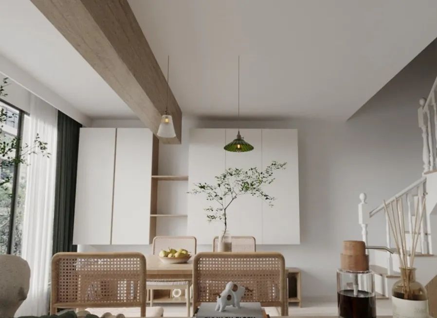 顶上的横梁是为了隐藏真梁,顶面运用木质元素让整体风格得到统一,无主灯设计使得横梁更显眼,质感高级。