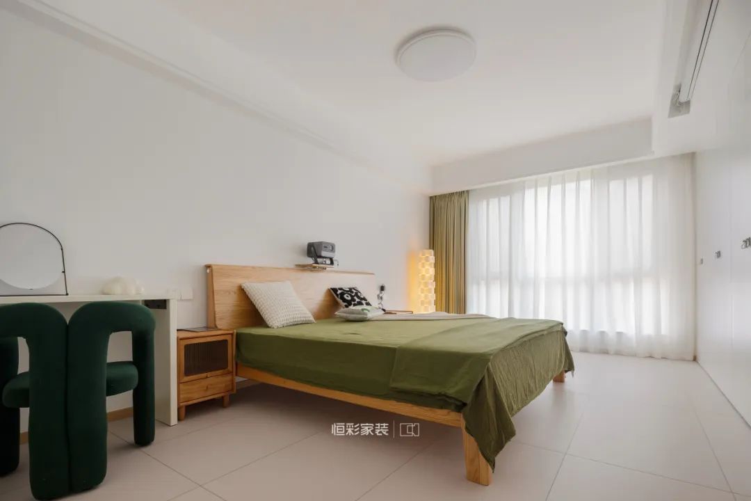 主卧软装同样以原木为主,这个暖焦糖色真的超美,在大面积白色衬托下明亮温暖,大气舒适。