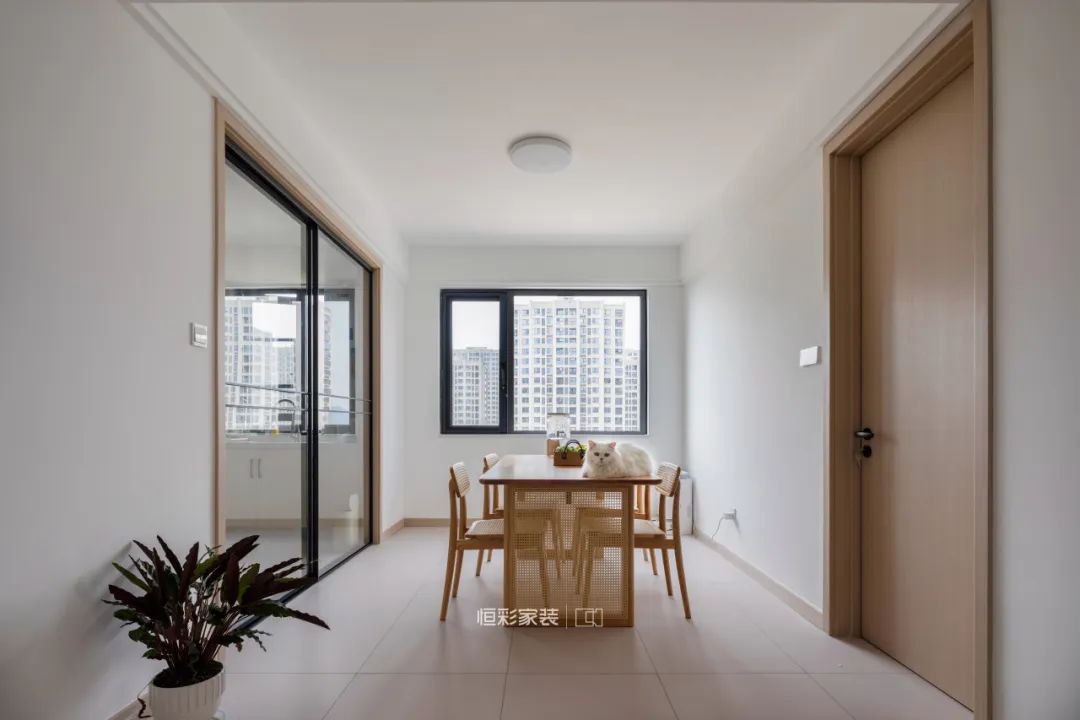 进门两侧延伸到客厅走廊统一定制柜体,一侧满足玄关出入需求,一侧作为全屋储藏空间的补充;白色柜体纯净简洁,入户门也改成白色,视觉上统一清爽。