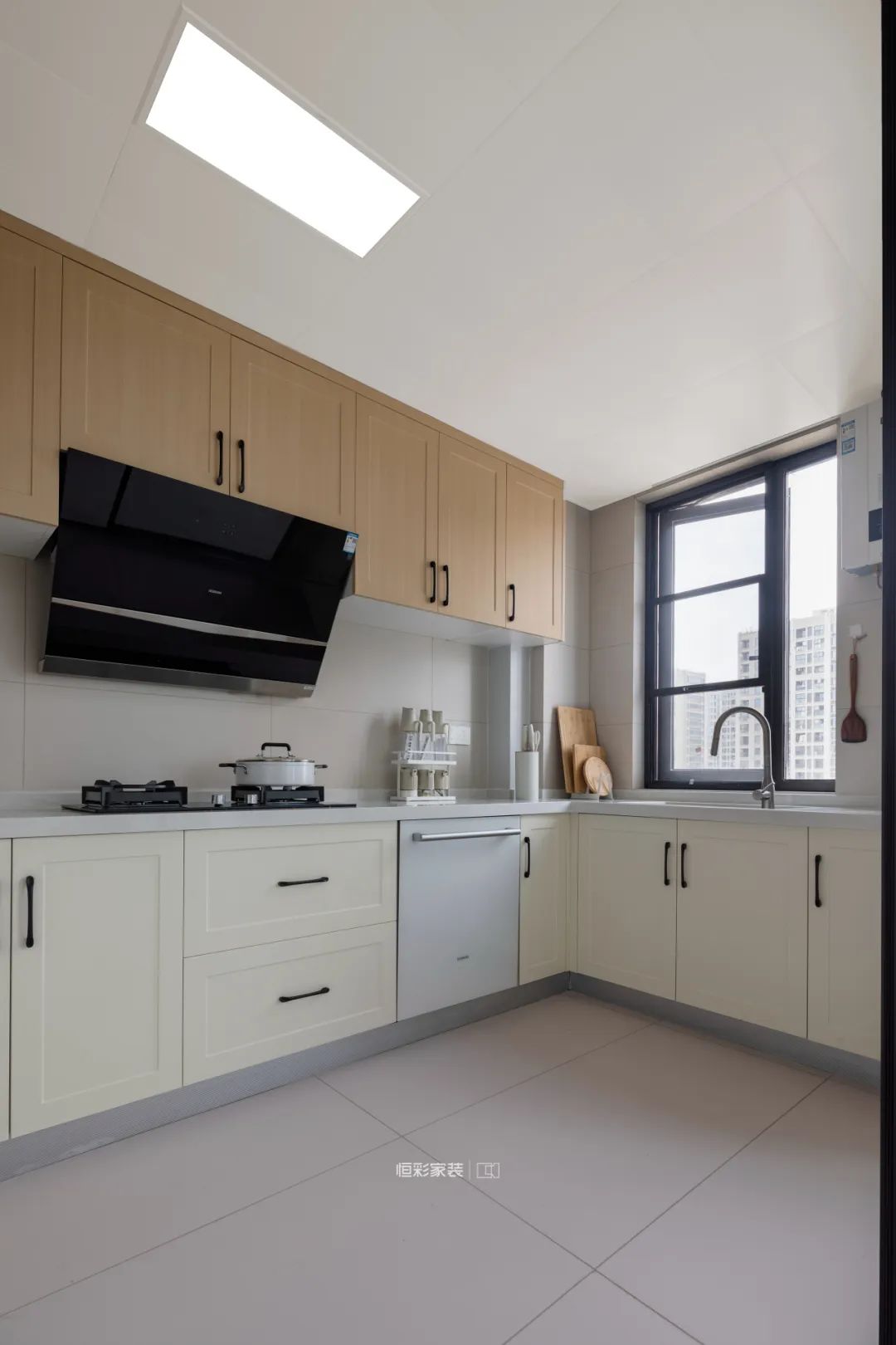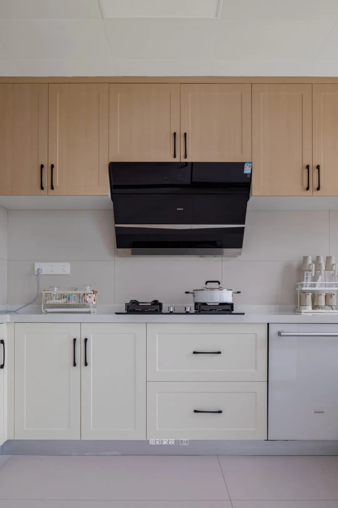 厨房地面与橱柜都是浅色系,柜子定制了温柔的原木+奶白色搭配黑色把手,与橱柜错落布局显得空间宽敞明亮,台面充足。
