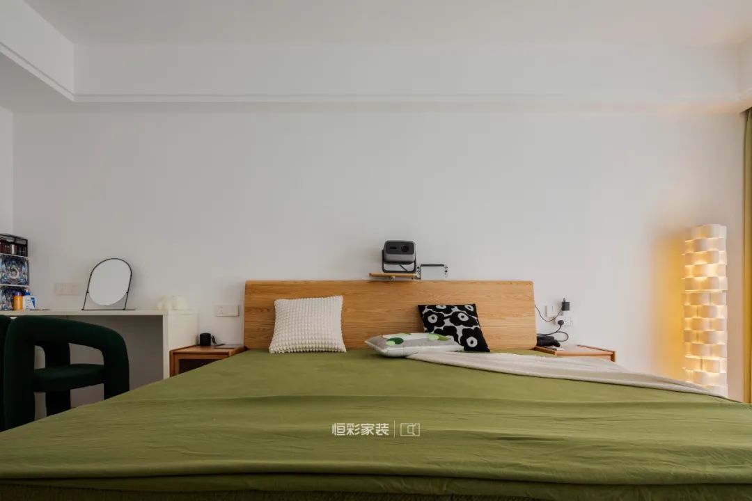 女屋主对主卧衣物收纳有很大需求,进门处与床尾设计两组衣柜,再多衣服也能容纳。吊顶处还预留了投影幕布的位置,后期增设投影。