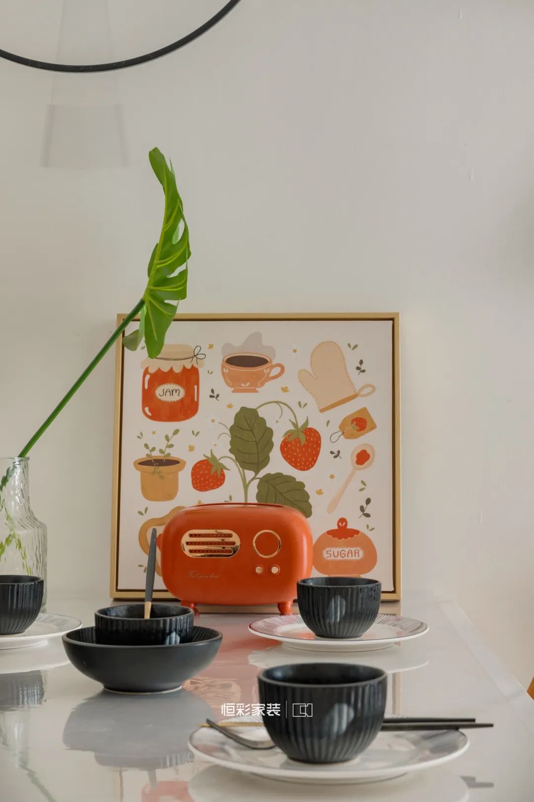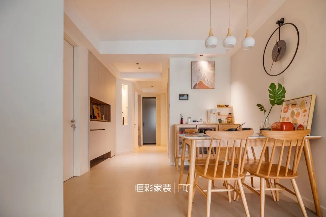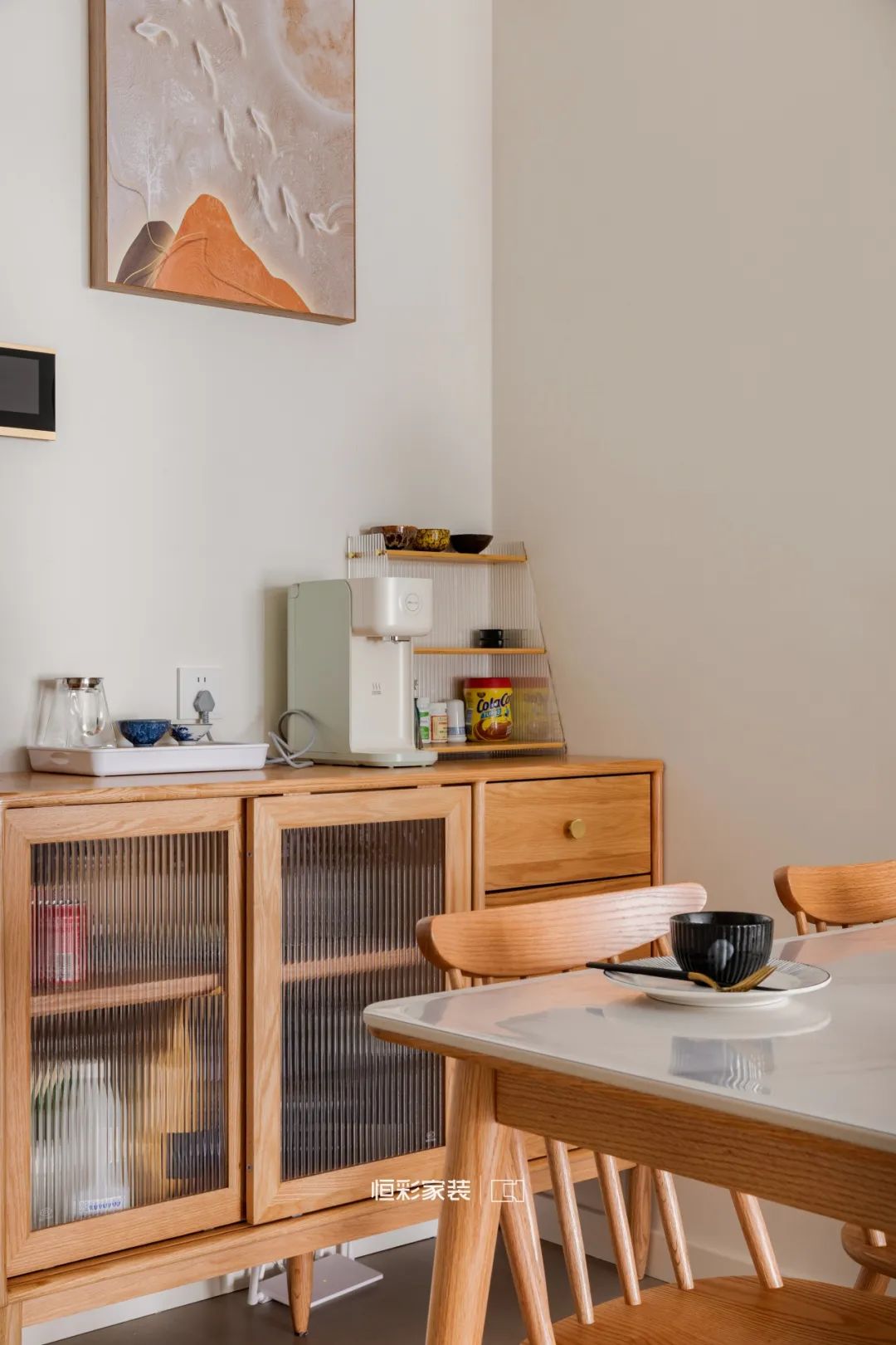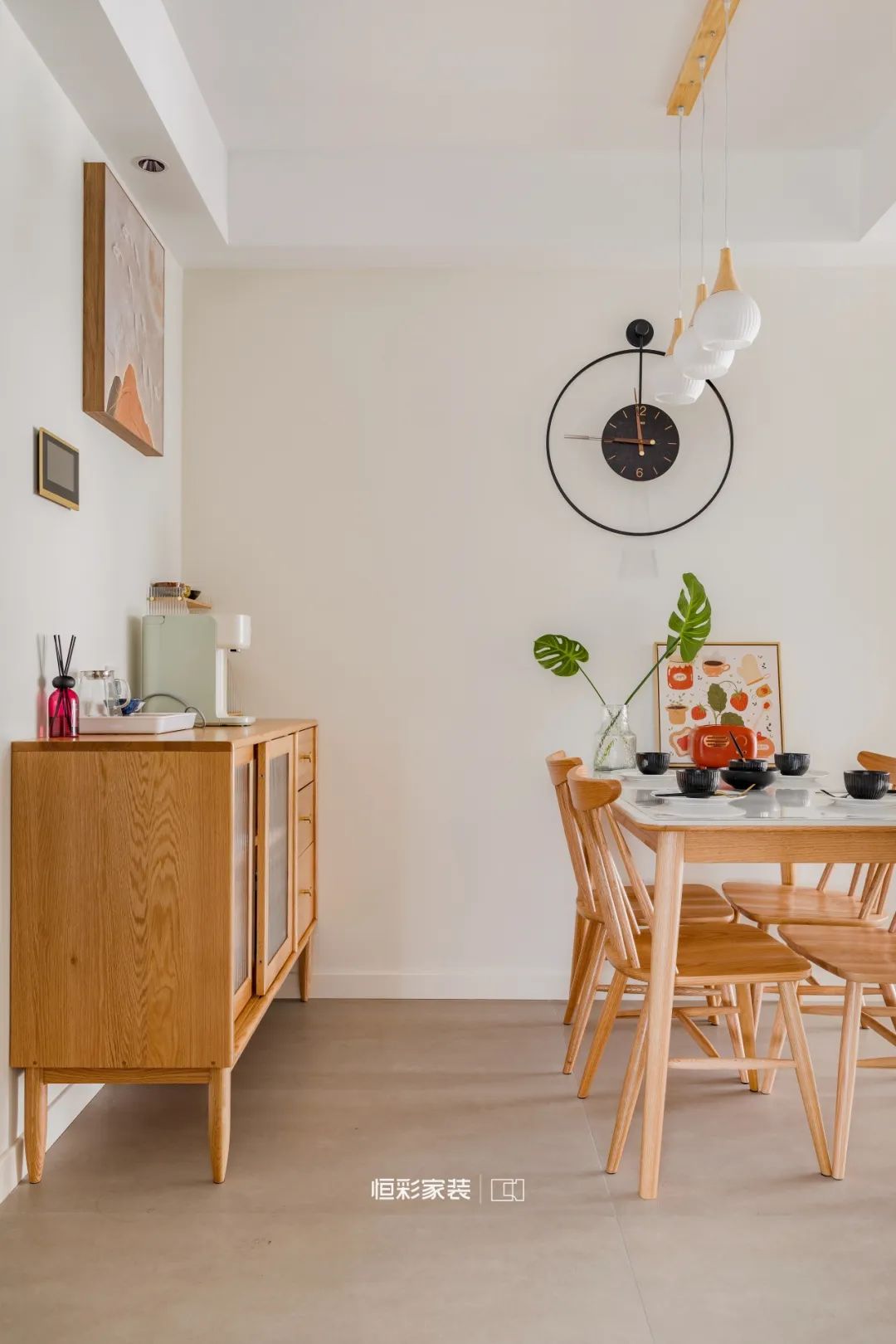 餐厅位于进门左侧,整体浅色原木格调的餐厅真正做到小而美,低矮的成品餐边柜既能满足实用需求,本身也是一个貌美的展示型小家具~