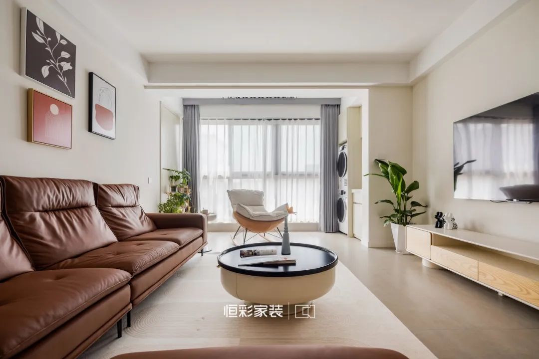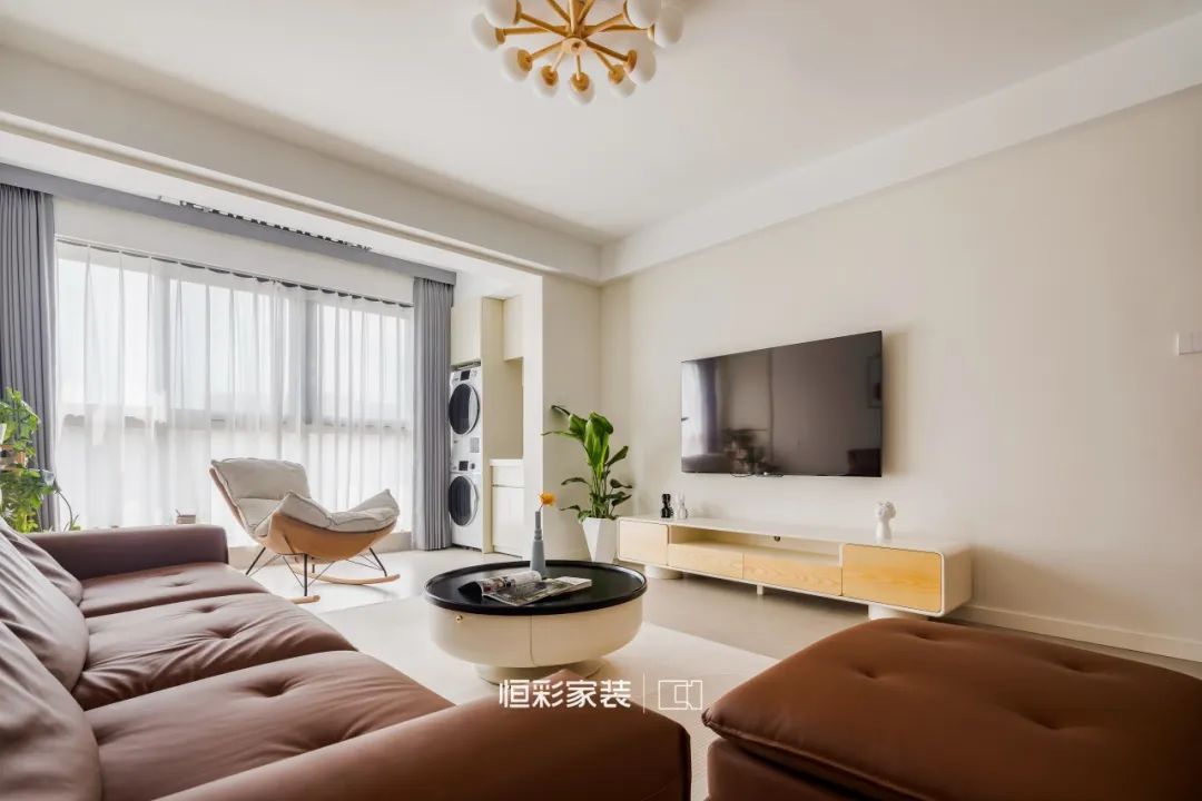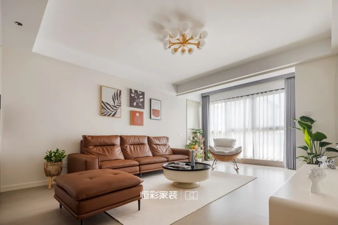 客厅装修以奶白色为主,以清新简洁的氛围引领全屋设计。大平顶营造出轻盈自然的空间氛围。