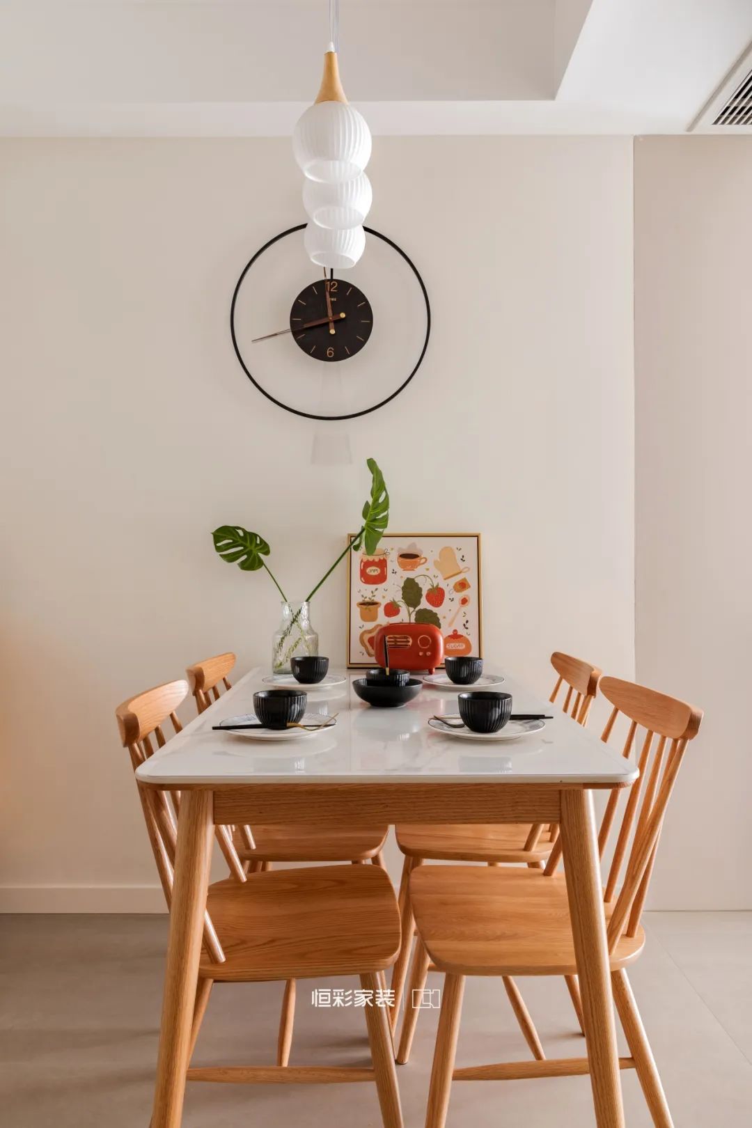 自然光给客餐厅带来一层美颜滤镜,四人方餐桌搭配原木餐椅,清新之余不乏精致感。精致小吊灯适配度满分。