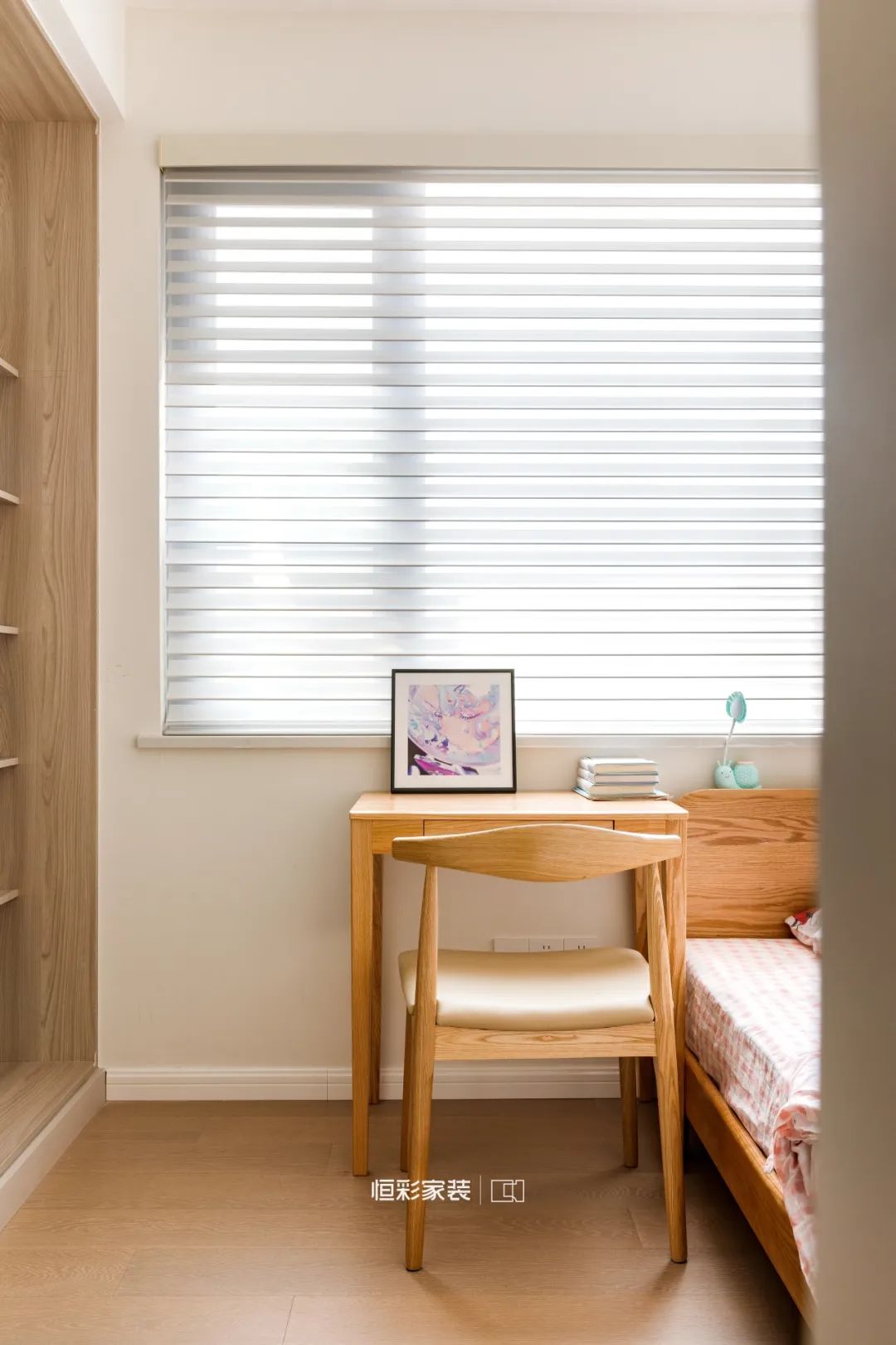 次卧空间简单留白,原木家具,白+木衣柜,靠窗预留学习区。