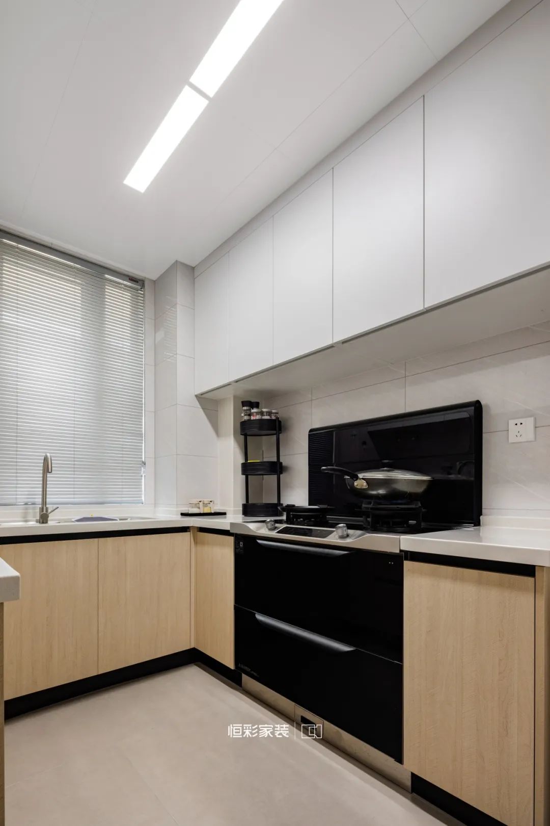 U型厨房可以很好地规划功能空间,原木色橱柜+白色石英石台面,白色墙砖简单清新,不仅给人温馨舒适的感觉,而且不易显脏,方便日常清洁。