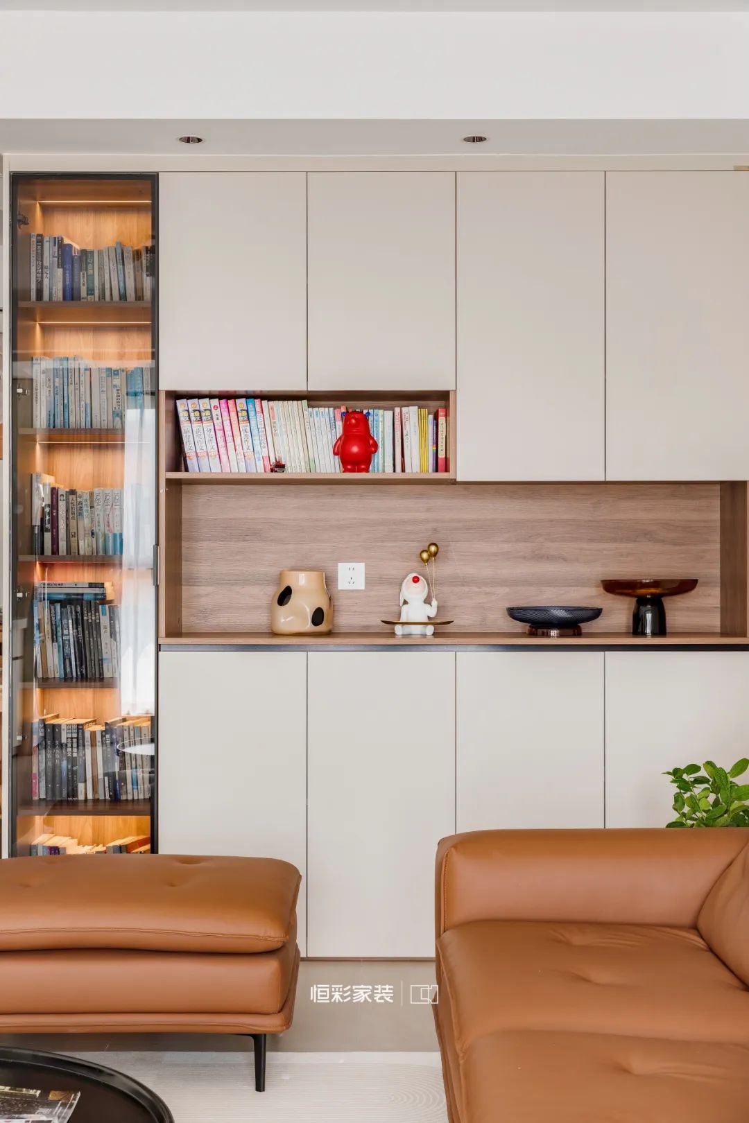 家里需要更大的储物空间,充分利用大客厅定制收纳柜,书柜与公区储藏空间都有了。