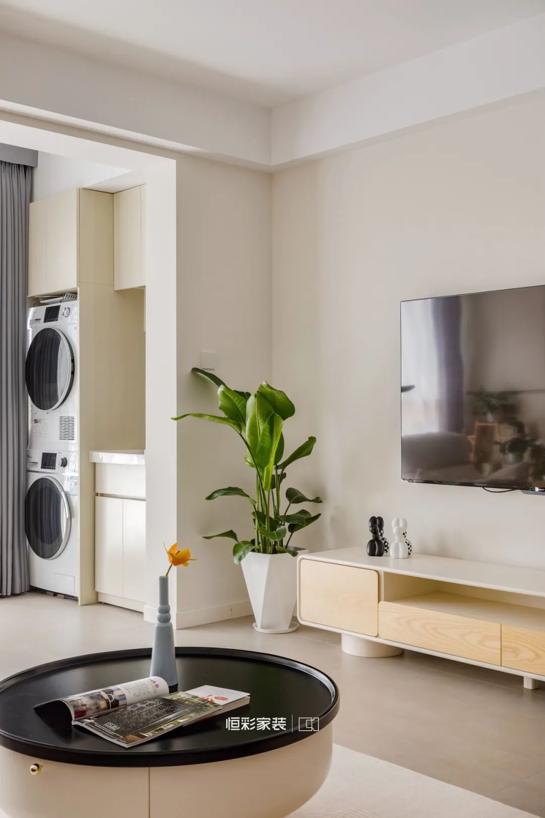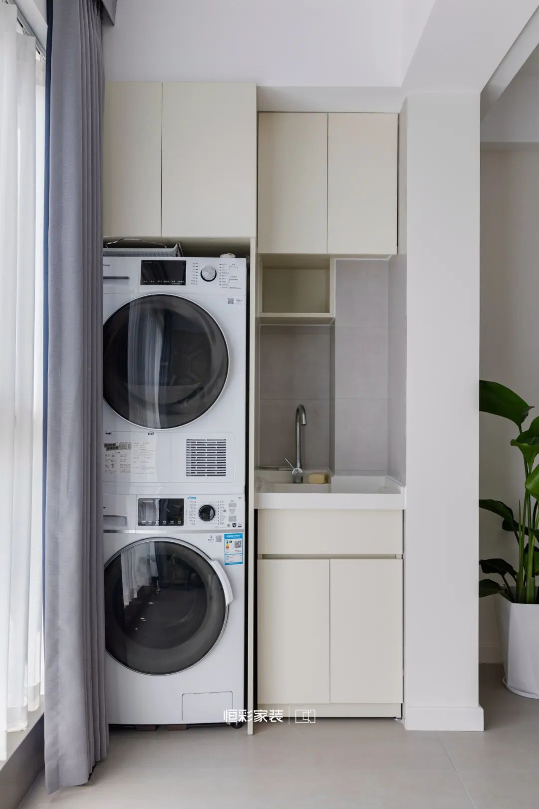 阳台定制收纳柜嵌入洗烘设备,还有充足的收纳空间,小阳台功能多又丝毫不杂乱。