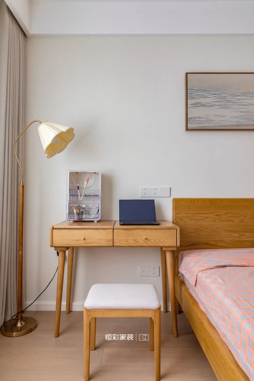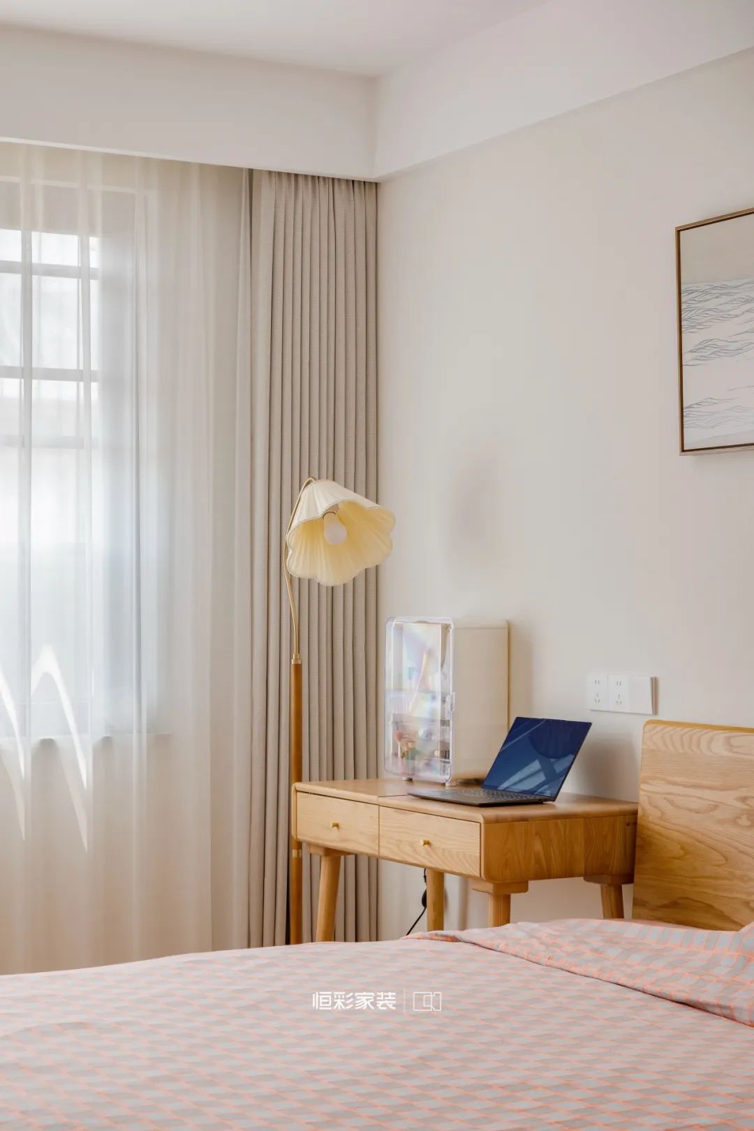 主卧预留了书桌位置,为居住者提供了一个专注学习、工作或阅读的私密空间。花朵造型的落地灯使整个空间更加温柔、文艺。