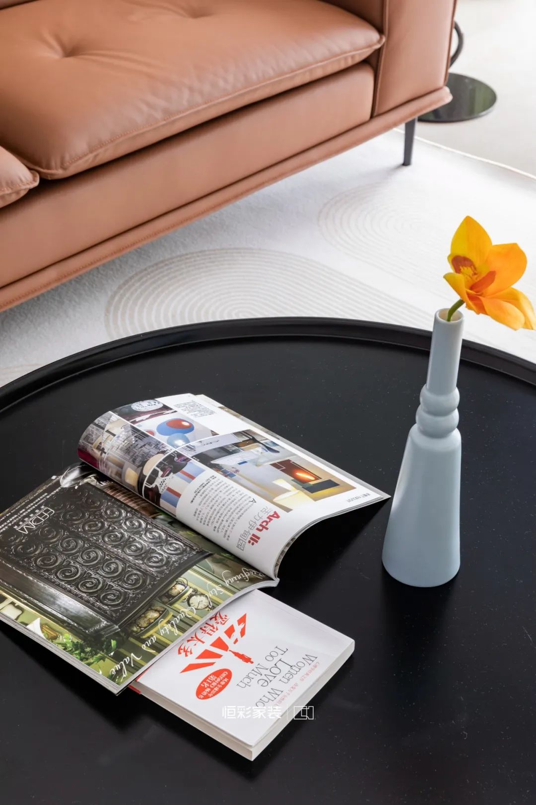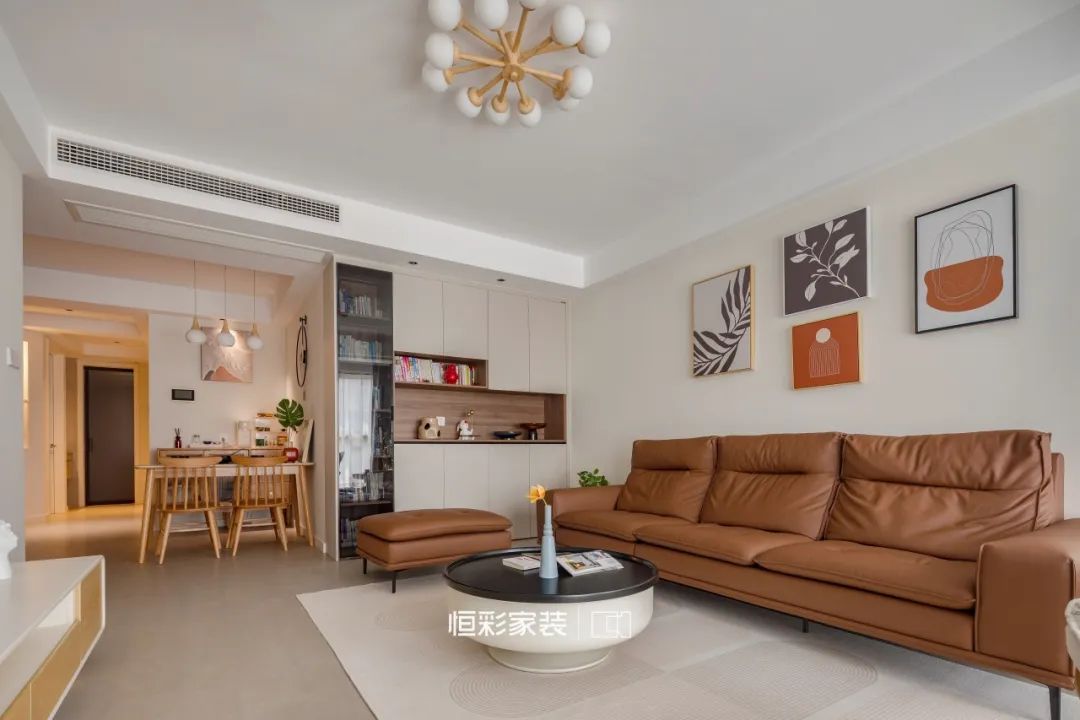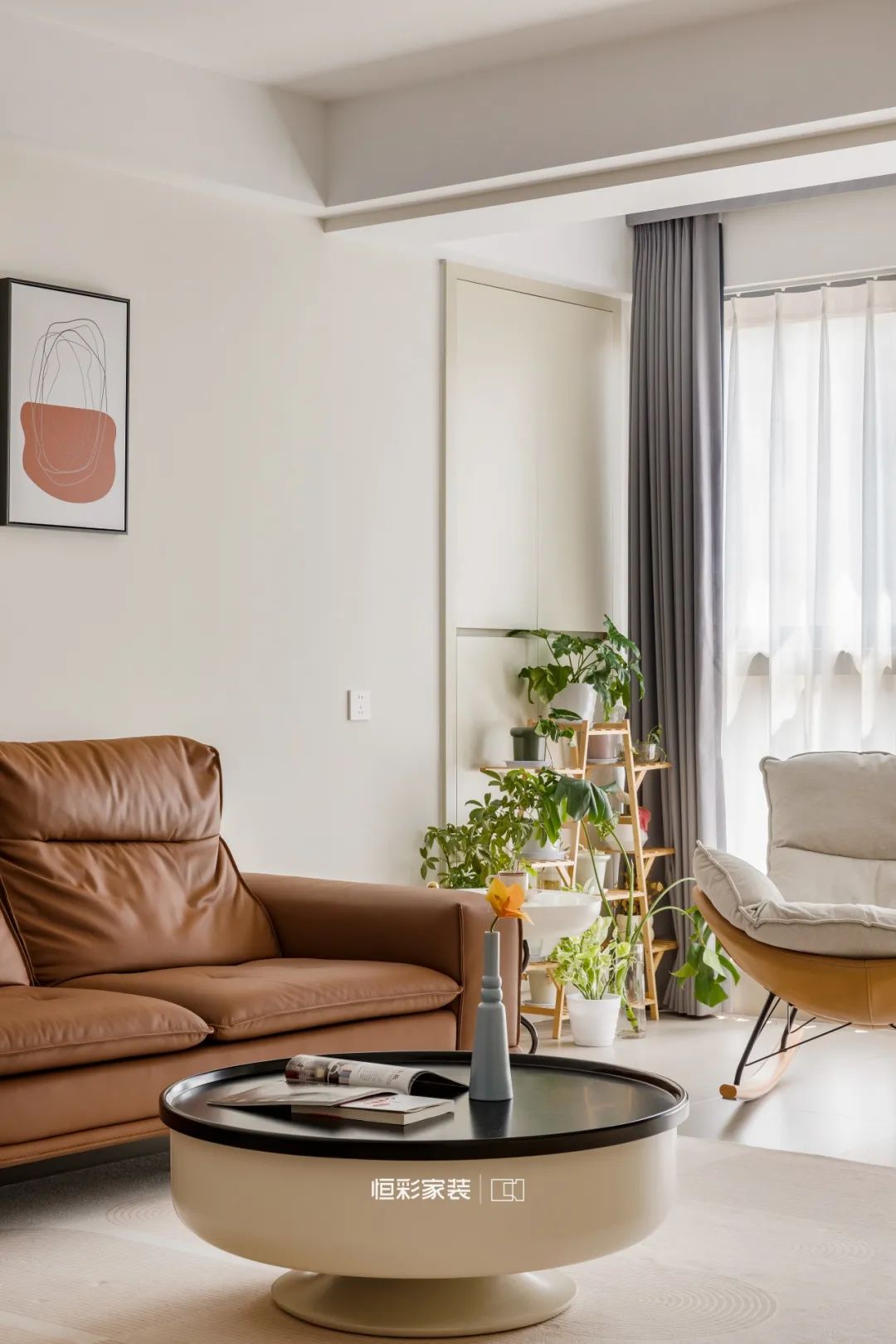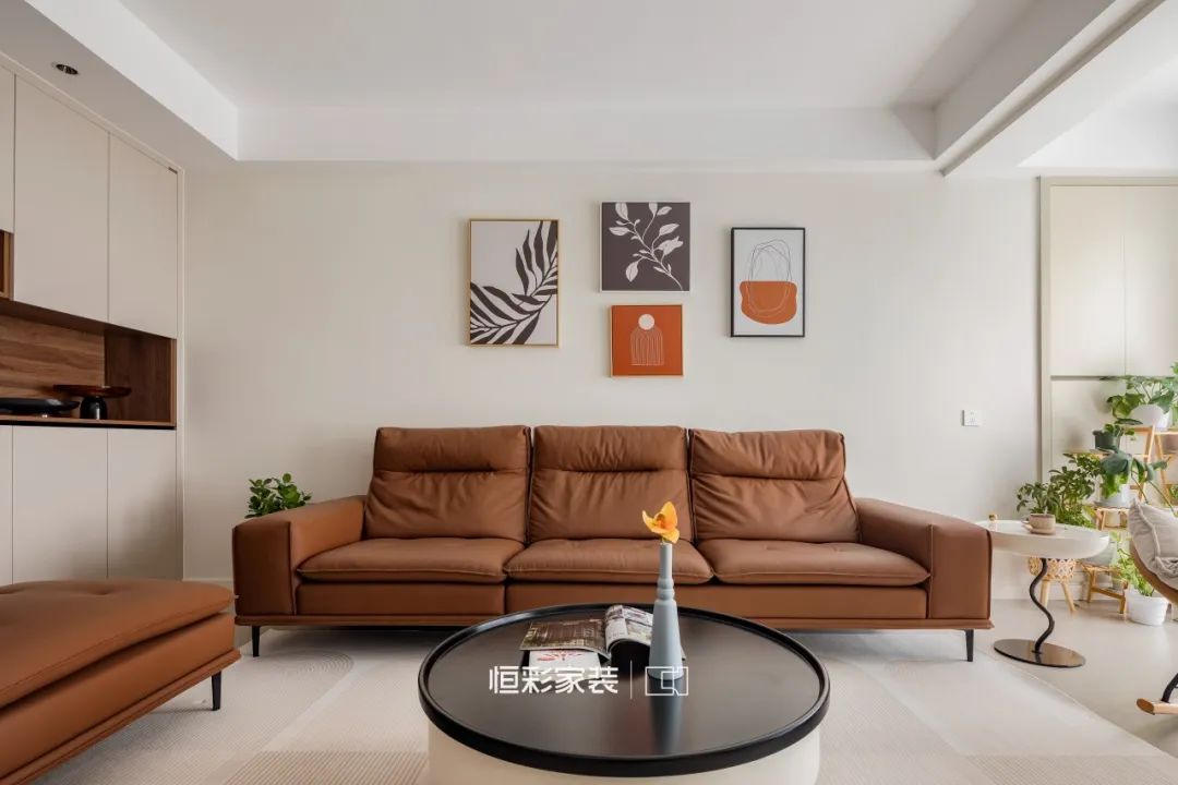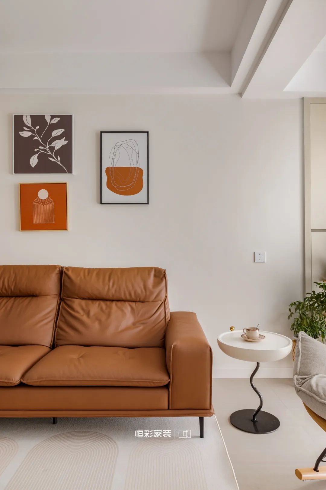 土橙色落地沙发营造柔和温馨的客厅氛围,以地毯+小圆几代替传统茶几,打造互动型儿童活动空间,有娃家庭才懂得,这样的客厅实用又灵活。
