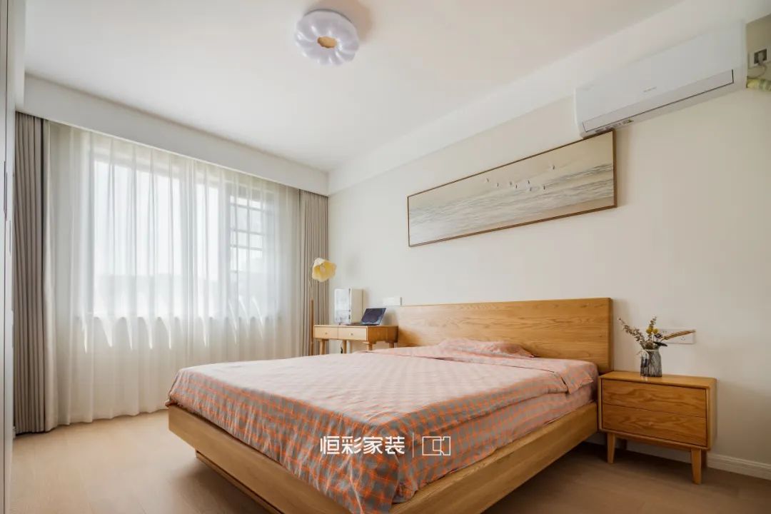 主卧以原木+奶咖色为主,呈现出清新素雅的氛围,为居住者提供了一个舒适宁静的休息空间。整体设计简洁大方,底色浅色调的墙面和家具使空间更显明亮通透。