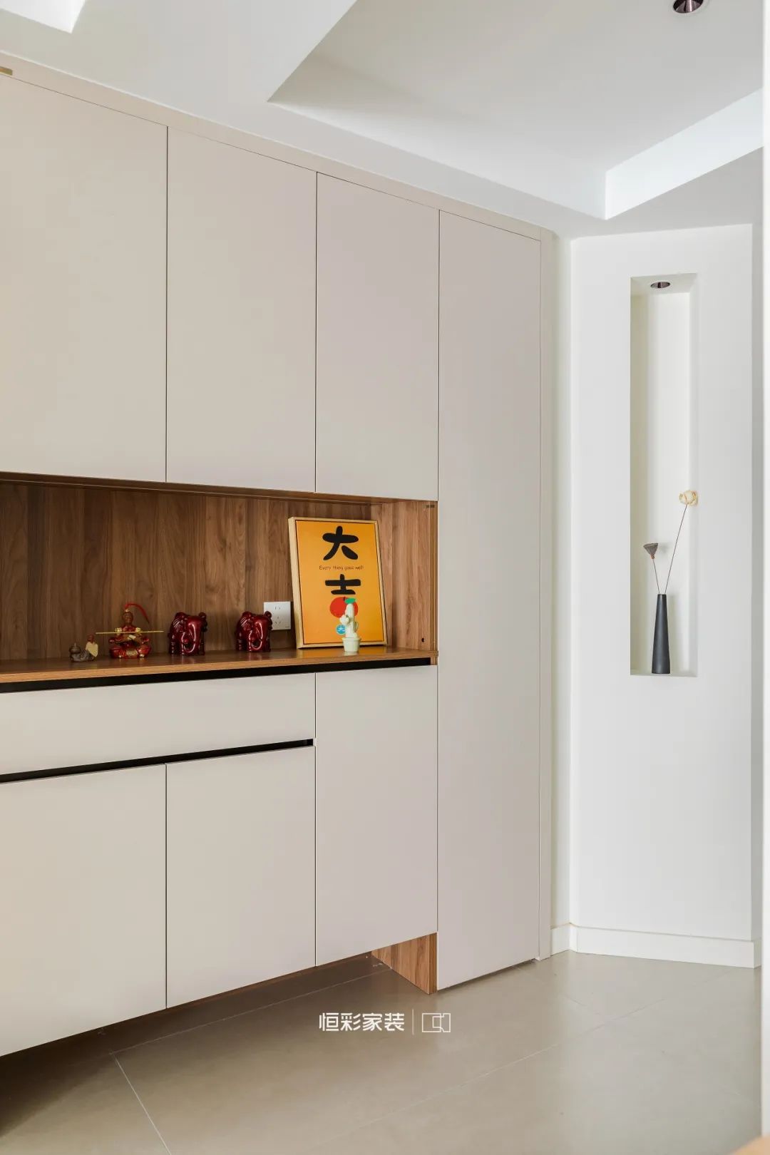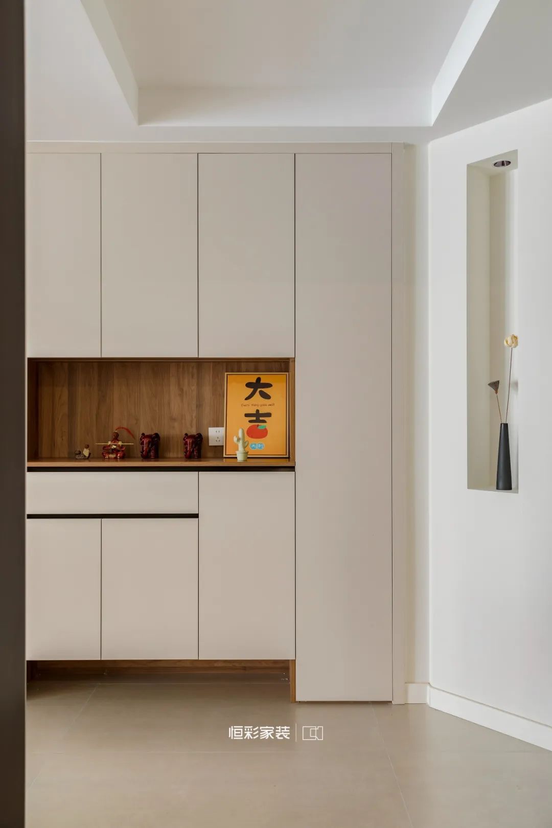 入户无玄关,需“造”出一个玄关区满足出入需求,于对向墙体嵌入式定制玄关柜,借用次卧空间有了玄关柜兼端景区,又能保证门厅足够的活动空间,再设计斜切墙体过渡到静区;