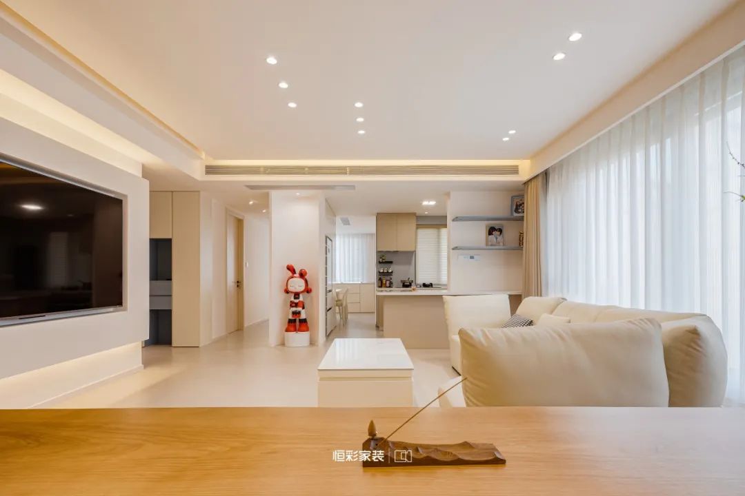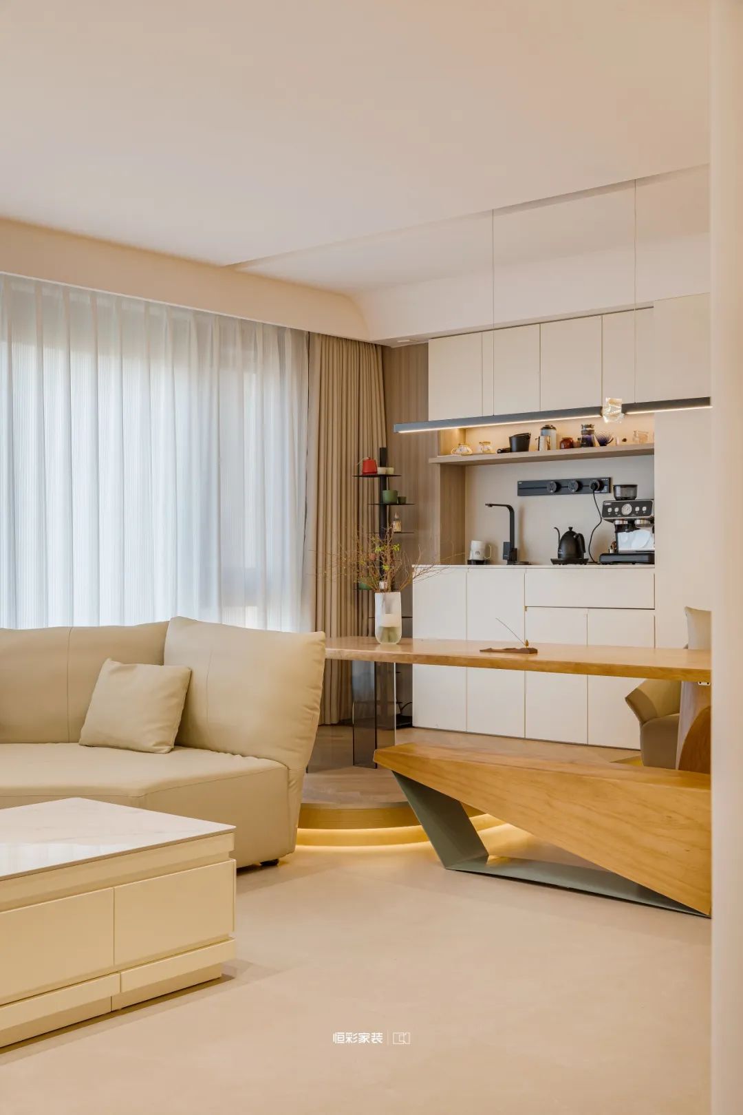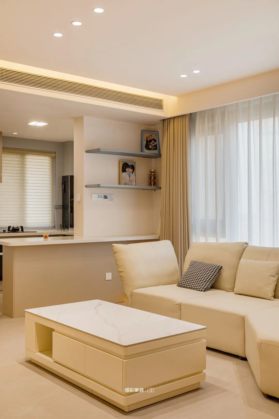 电视做嵌入式处理,与隐形柜门巧妙结合,使墙面保持整洁和统一,客厅看起来更加宽敞透亮。客厅与厨房之间采用吧台作为隔断,增加两组开放收纳格补全视觉上的空缺,这一设计不仅有效区分了功能区域,同时保持了空间的通透感与整体性,使视觉上更加宽敞连贯