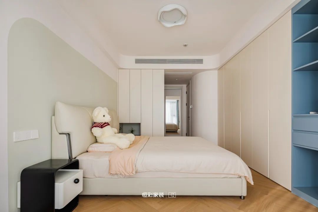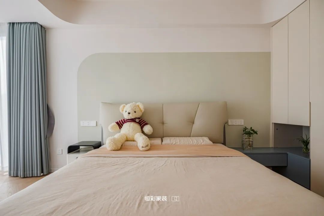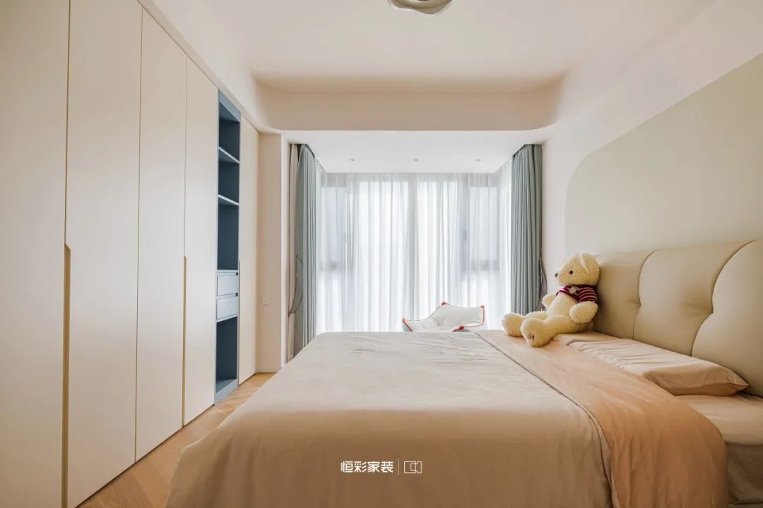 蓝白拼色窗帘,为房间增添了一抹亮色,柔和的色调使整个空间更显生动和温馨。整间卧室在设计上注重细节与品质的完美结合,每一个元素都经过精心考量。