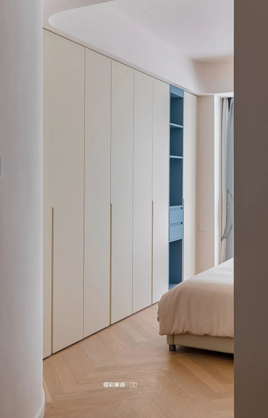 主卧以米白色为主调,展现出极致的优雅与高级感。两排衣柜,为收纳提供了充足的空间,不论是季节变换还是日常收纳都能轻松应对,让收纳成为一种享受。