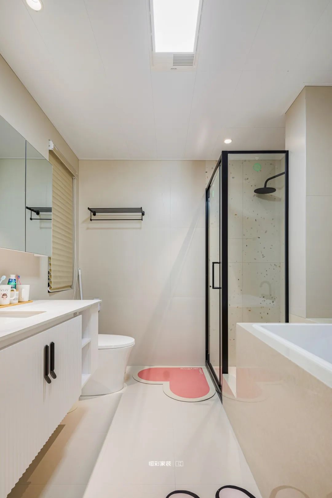 全屋保留了两个卫生间,充分考虑了每位家庭成员的日常生活需求。主卫采用了淋浴和浴缸一体化的设计,为业主提供了多种选择。瓷白台面的光滑质感与整体的奶油风格保持一致。同时,宽敞的台面提供了充足的置物空间,方便放置洗漱用品和化妆品。