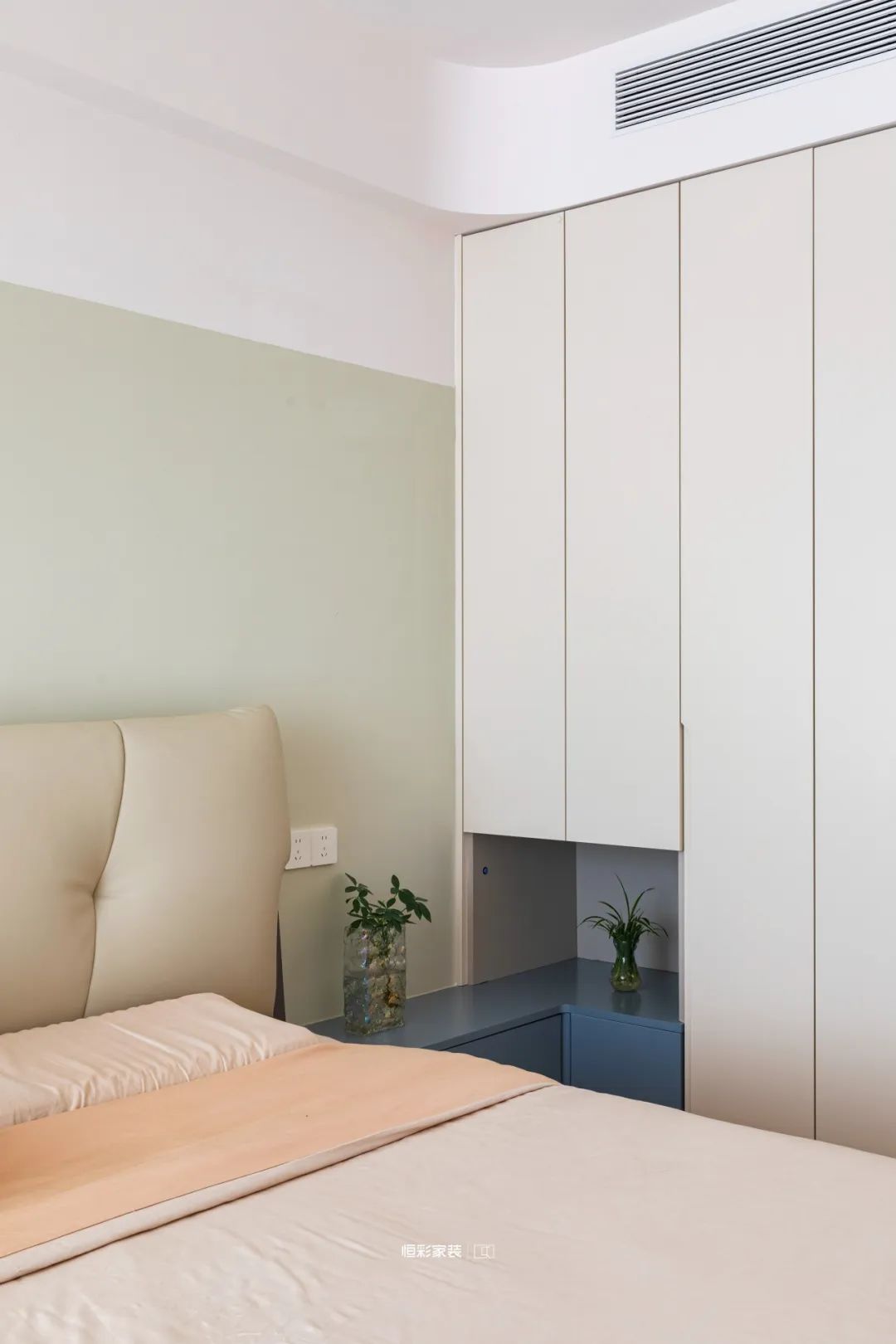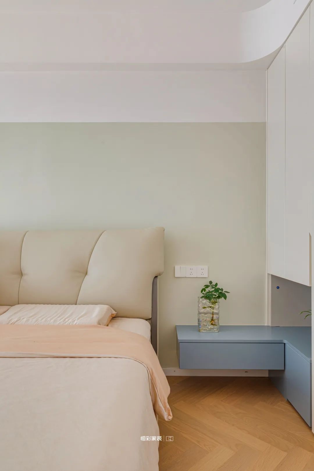 衣柜与悬空床头柜一体化的设计,不仅提升了整体的美观度,还增加了实用性,方便存放日常用品和小物件,使卧室更加整洁有序。
