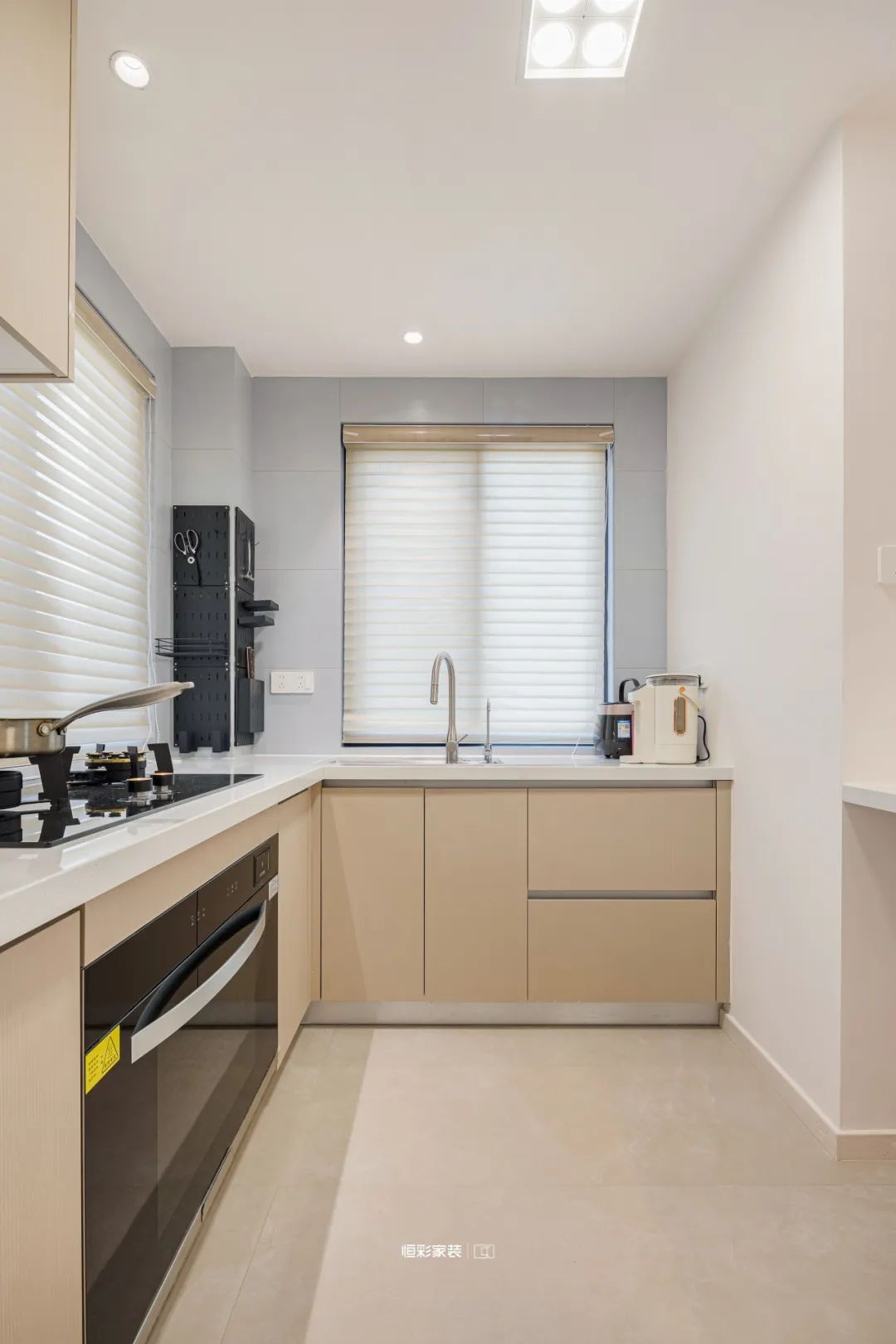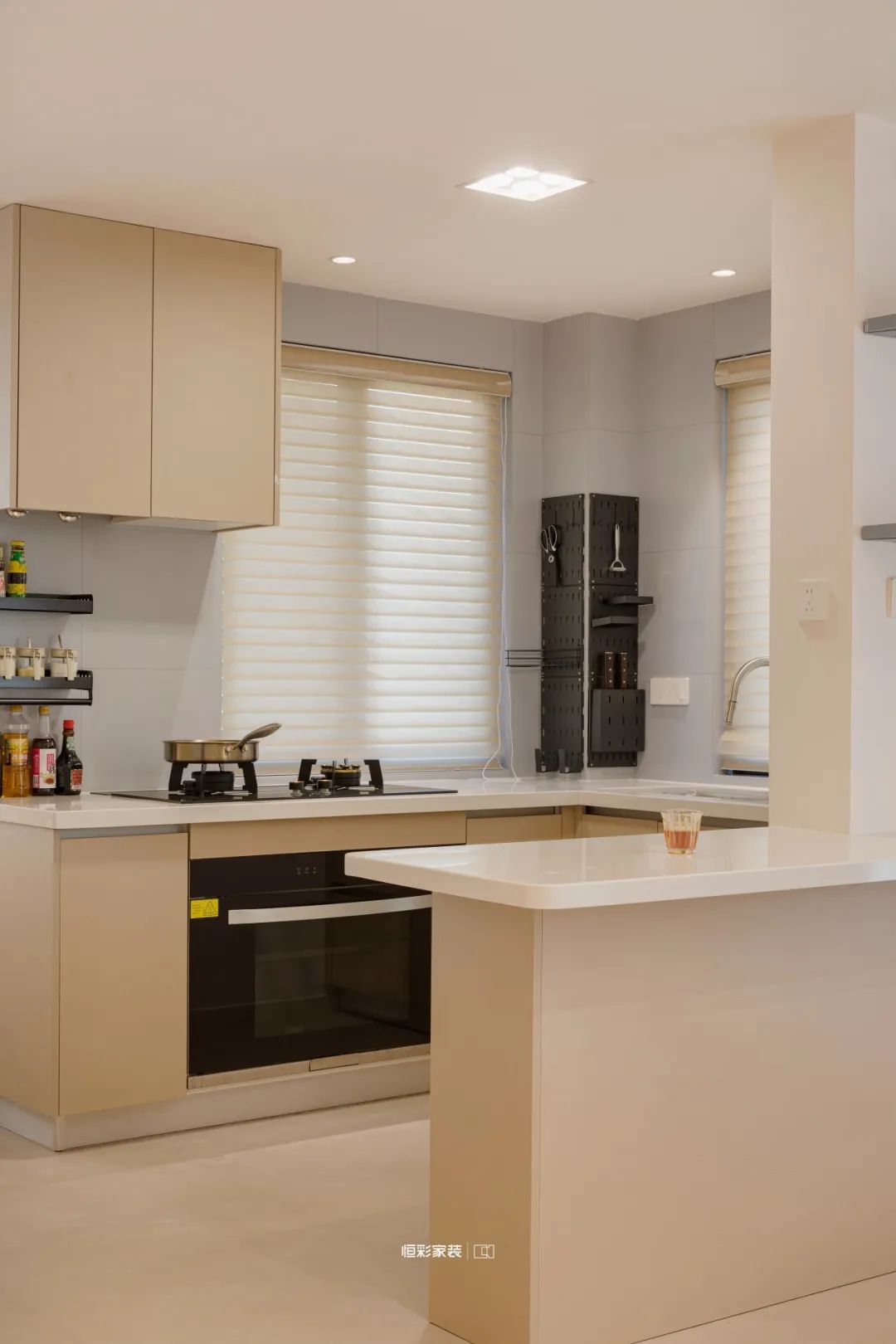半开放式布局将客厅、餐厅和厨房巧妙融合,整个空间既保持了独立性又有互动性。L型厨房的设计充分利用了角落空间,扩展了操作台面,为烹饪和备餐提供了充足的空间。